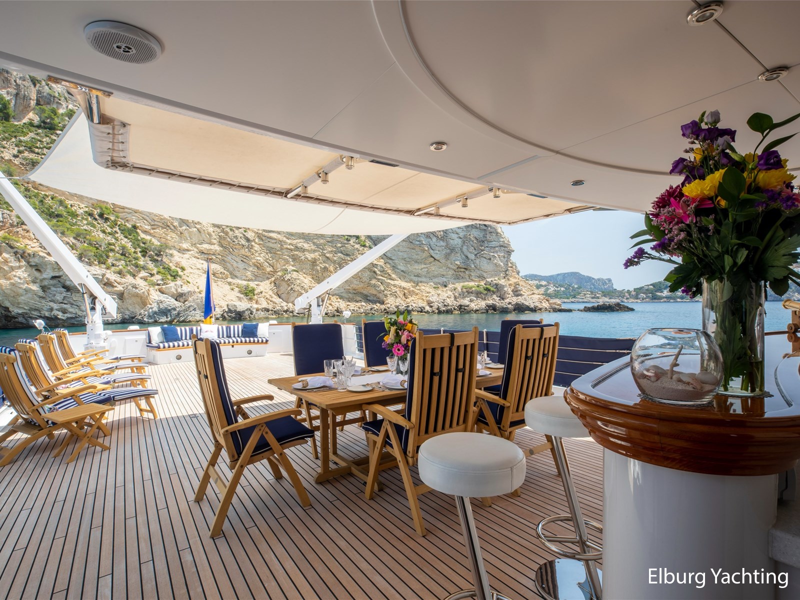 Het brugdek beschikt over een bar, vaste bank aan de achterzijde en veel dek-ruimte flexibel te gebruiken, zeker wanneer beide tenders worden ingezet. Een klein zonnedek bovenop de brug biedt enige privacy, grote zonnekussens en een prachtig uitzicht. Een bank op het voordek biedt extra privé zitplaatsen buiten.