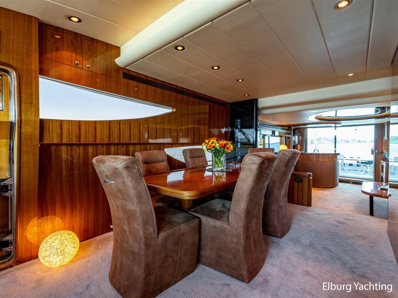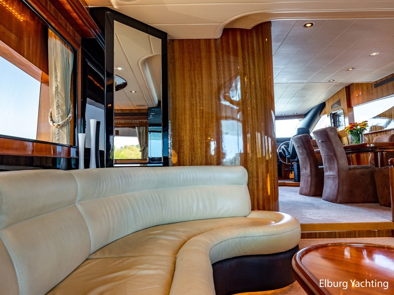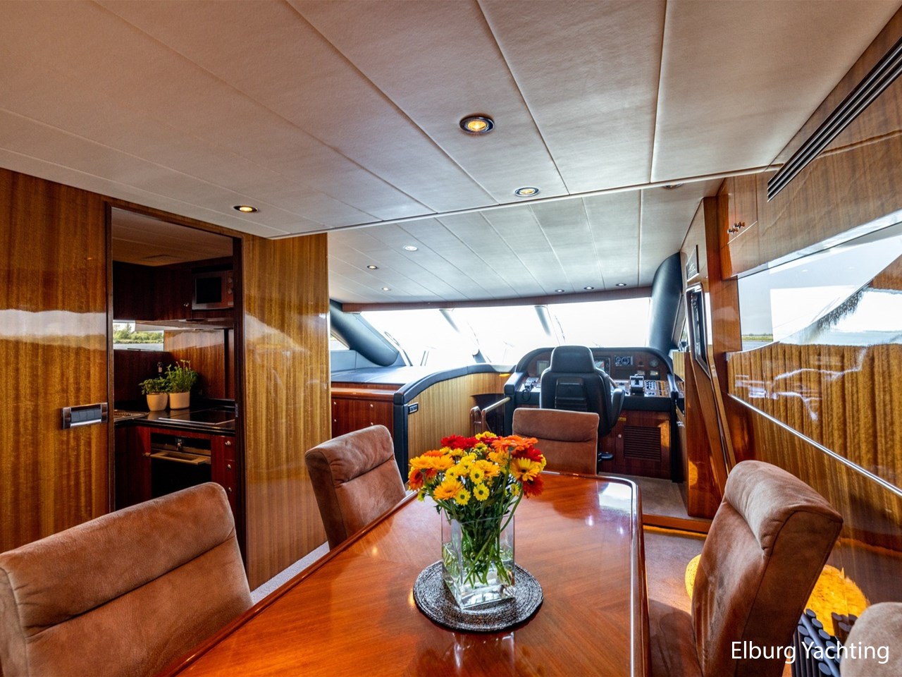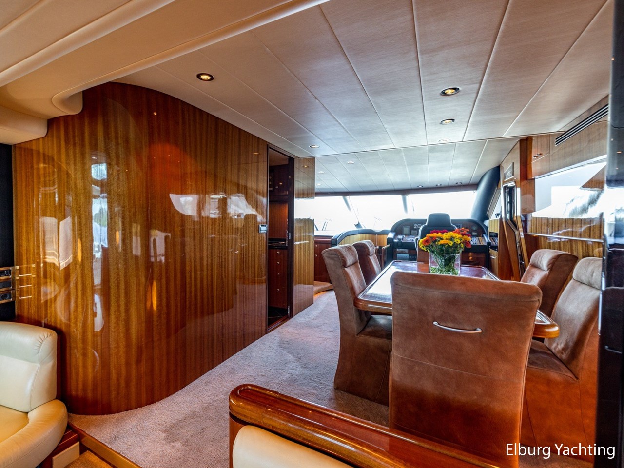 Vrijstaande eettafel in salon, L-dinette en loveseat in salon, ruime vaste sofa op flybridge