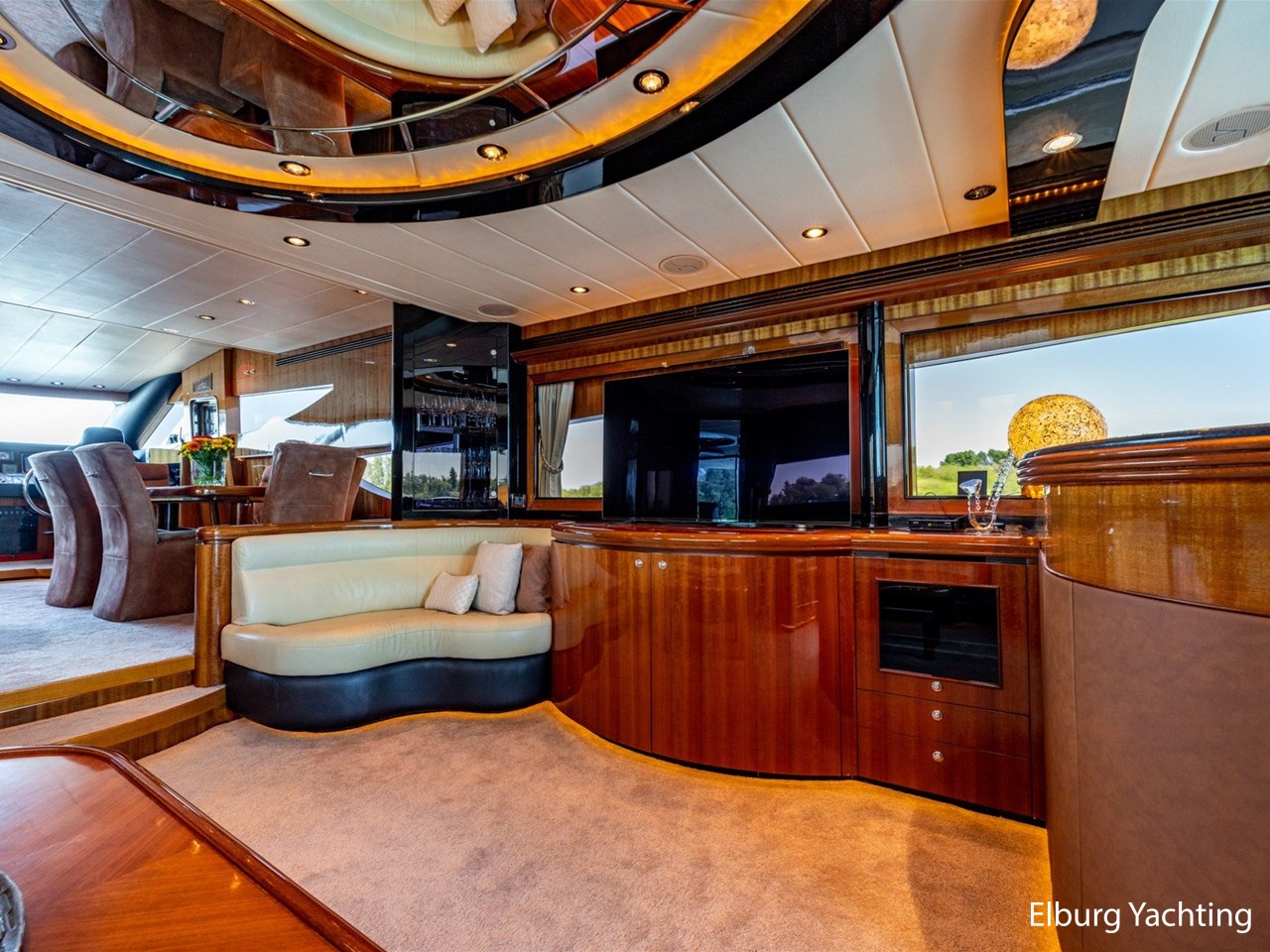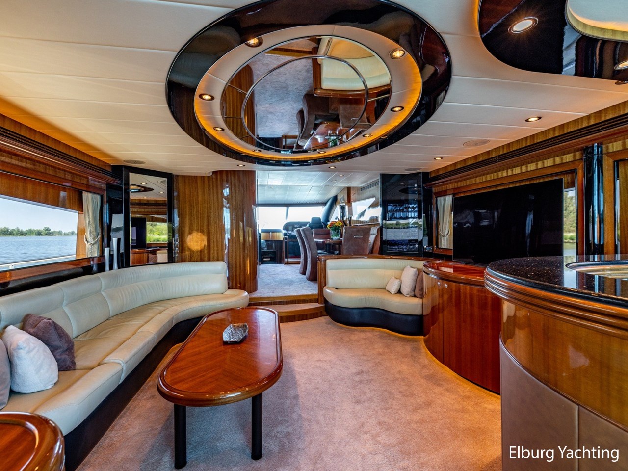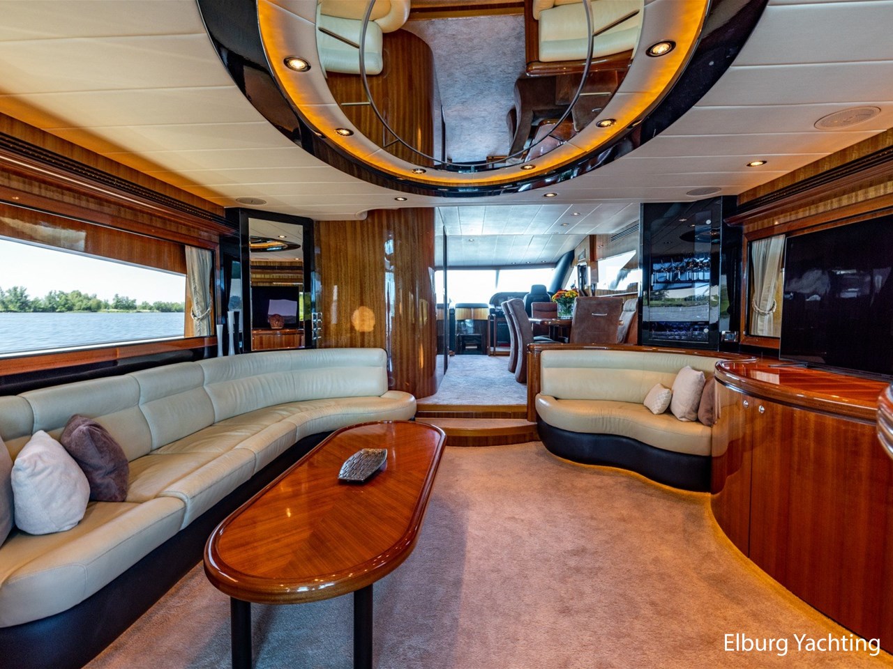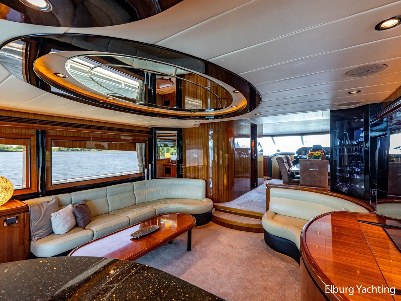Vrijstaande eettafel in salon, L-dinette en loveseat in salon, ruime vaste sofa op flybridge