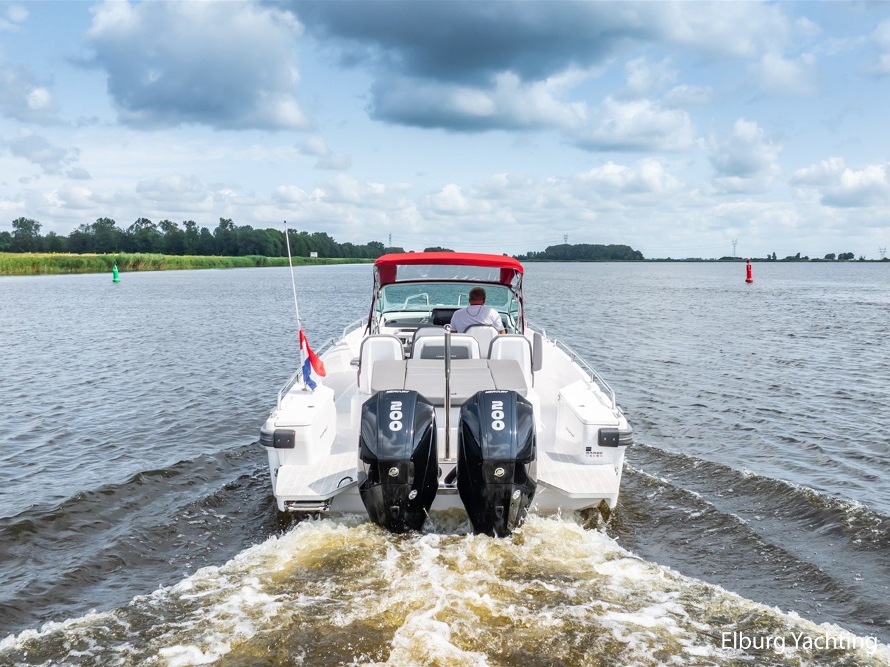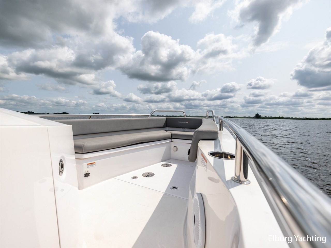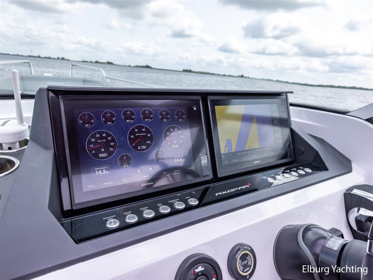Naast zijn hoge topsnelheid van Ca. 80 km/h beschikt deze veelzijdige Axopar 28 open over een Seastar Optimus 360 Joystick besturing systeem, Water ski pole, veel opberg ruimte, Trimtabs, wasbak bij toilet, wasbak onder vaarstoel, r.v.s bekeerhouders, draaibare stuurstoelen, veel zicht rondom, rubberen stootranden en een Fusion audio MS-NRX300 systeem.