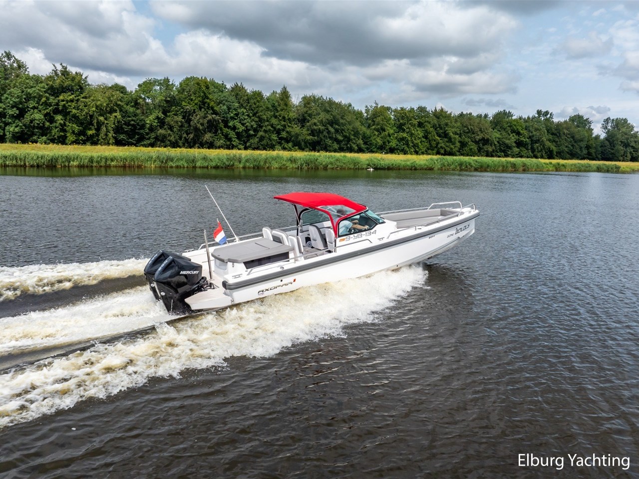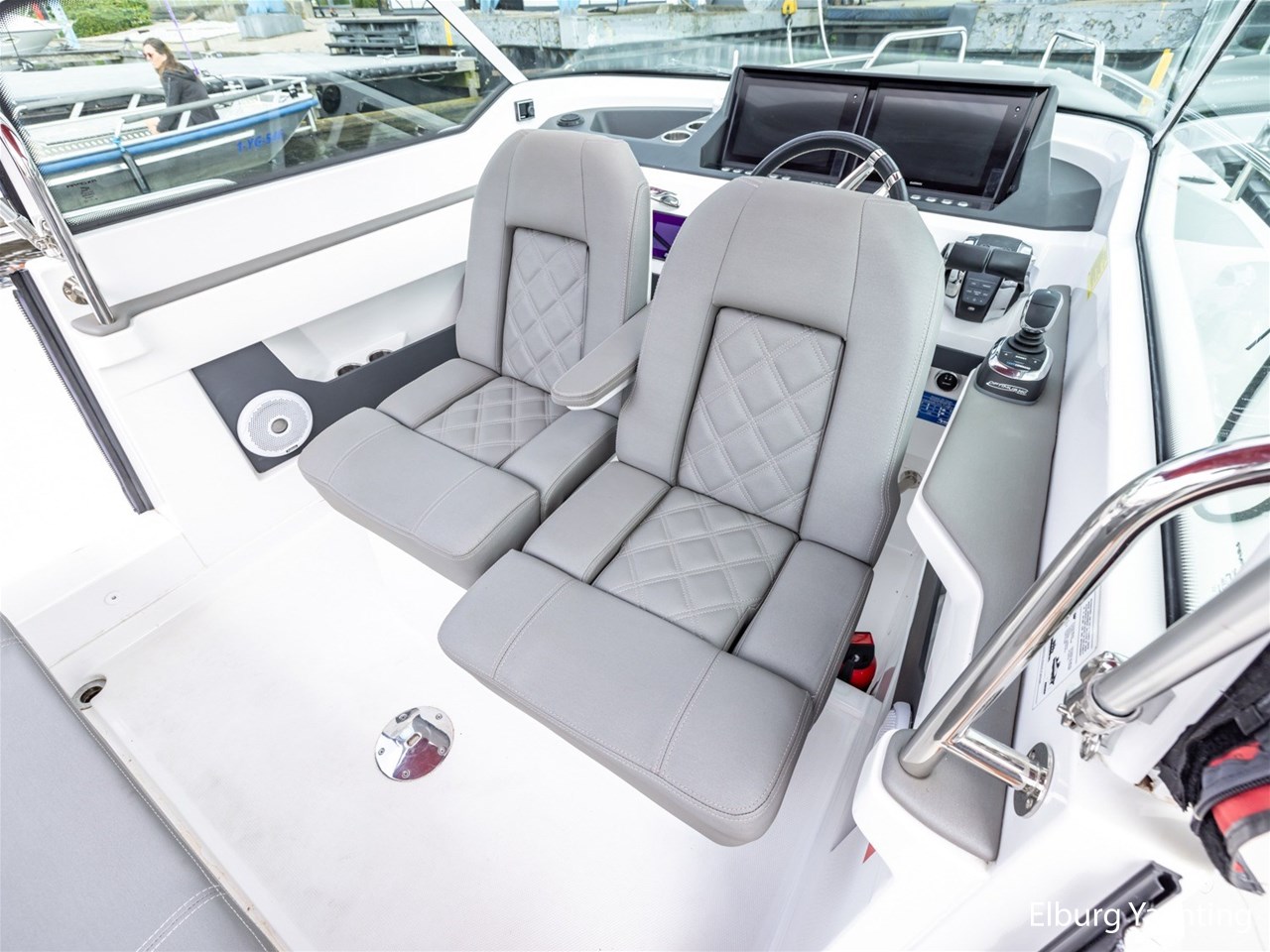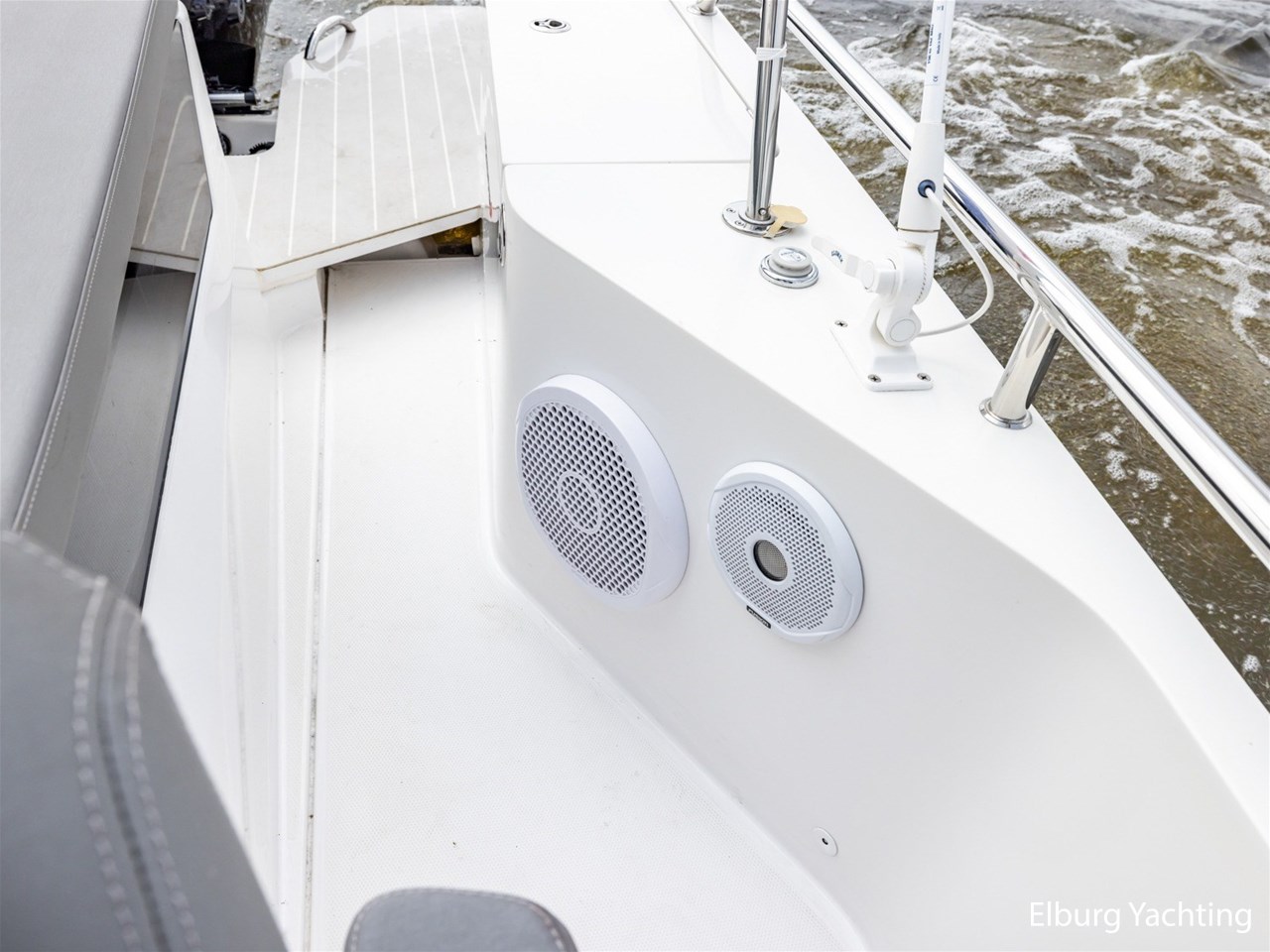 Naast zijn hoge topsnelheid van Ca. 80 km/h beschikt deze veelzijdige Axopar 28 open over een Seastar Optimus 360 Joystick besturing systeem, Water ski pole, veel opberg ruimte, Trimtabs, wasbak bij toilet, wasbak onder vaarstoel, r.v.s bekeerhouders, draaibare stuurstoelen, veel zicht rondom, rubberen stootranden en een Fusion audio MS-NRX300 systeem.