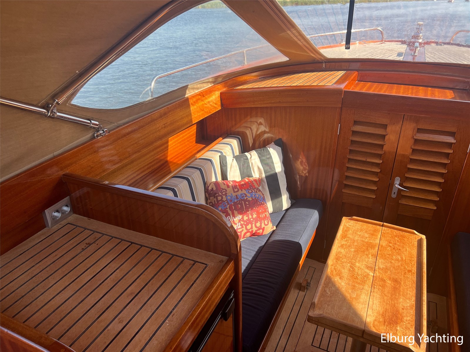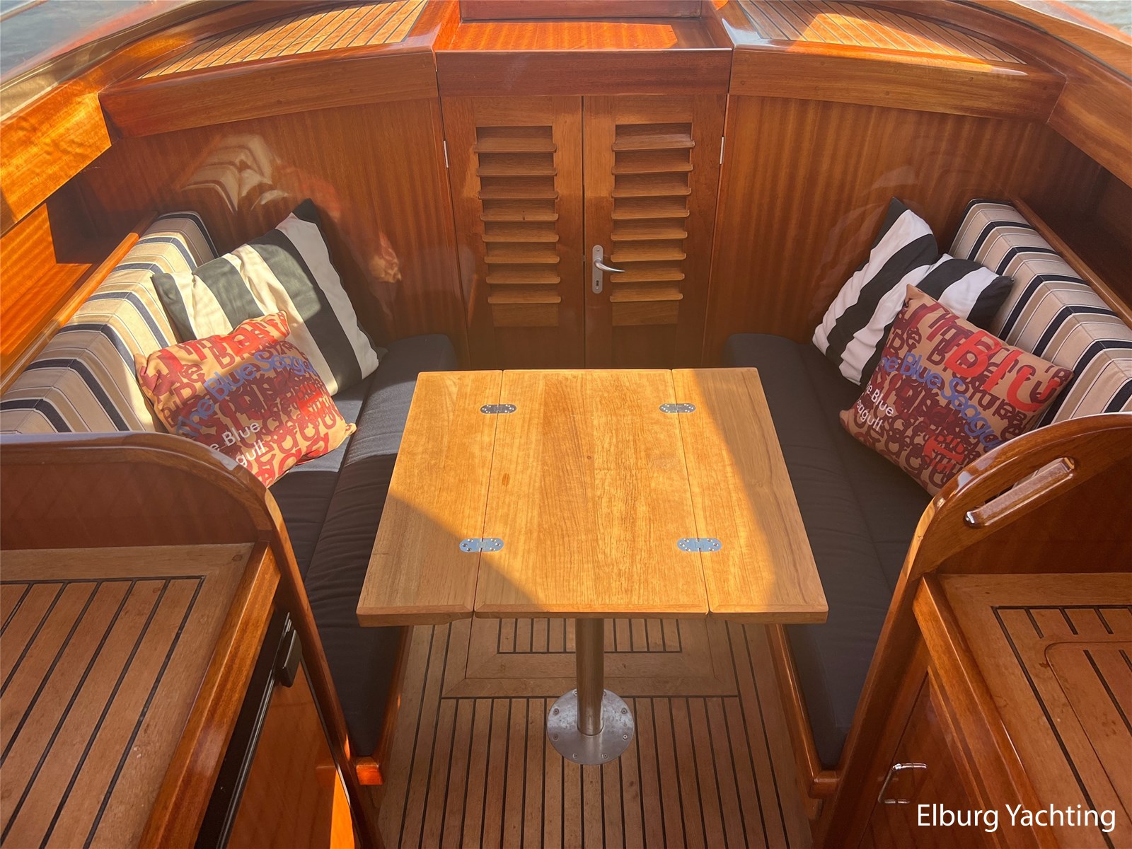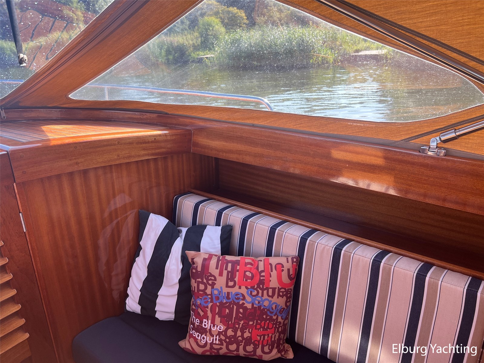 - Teakhouten interieur met wit/donkerblauwe bekleding
