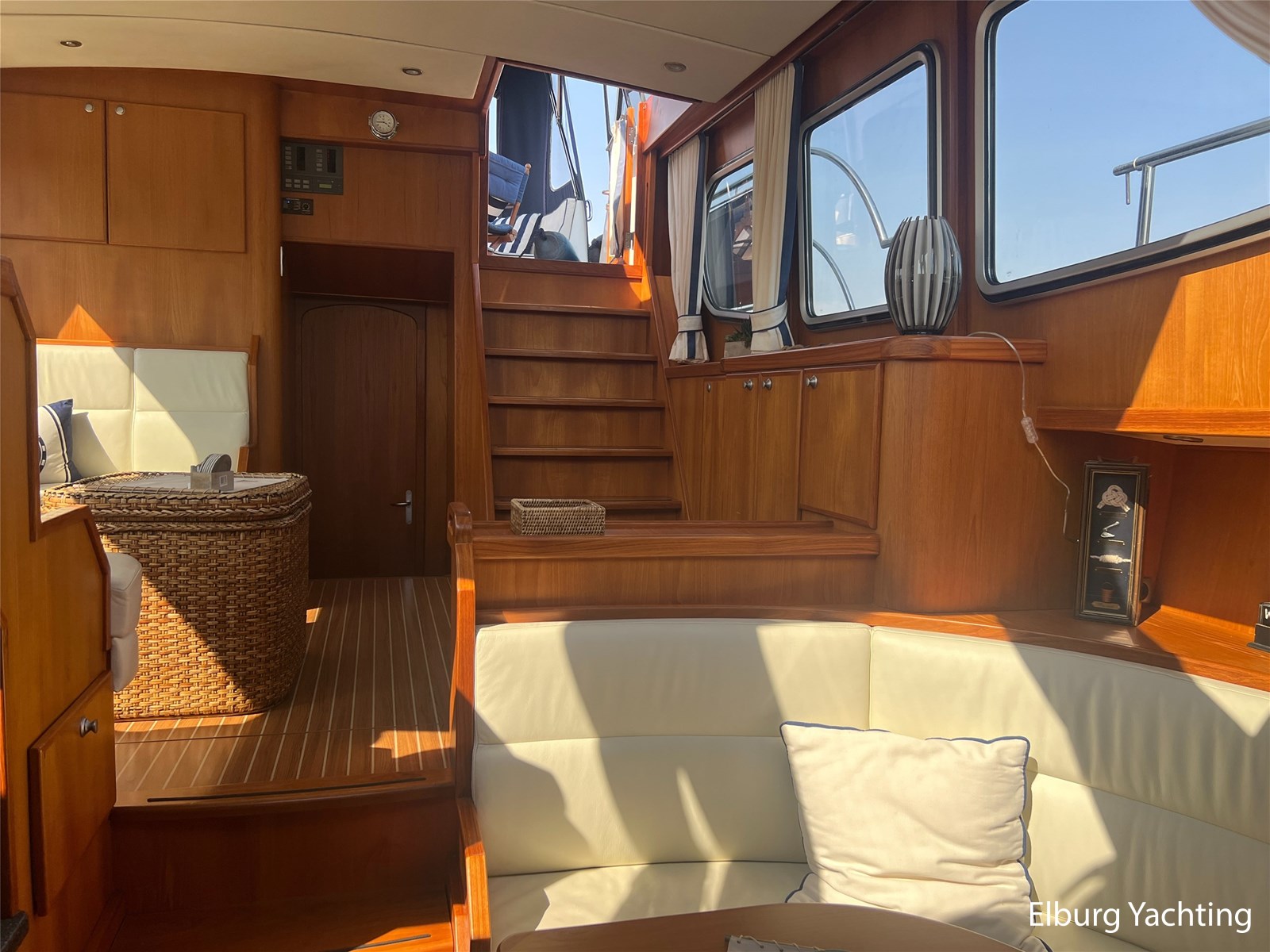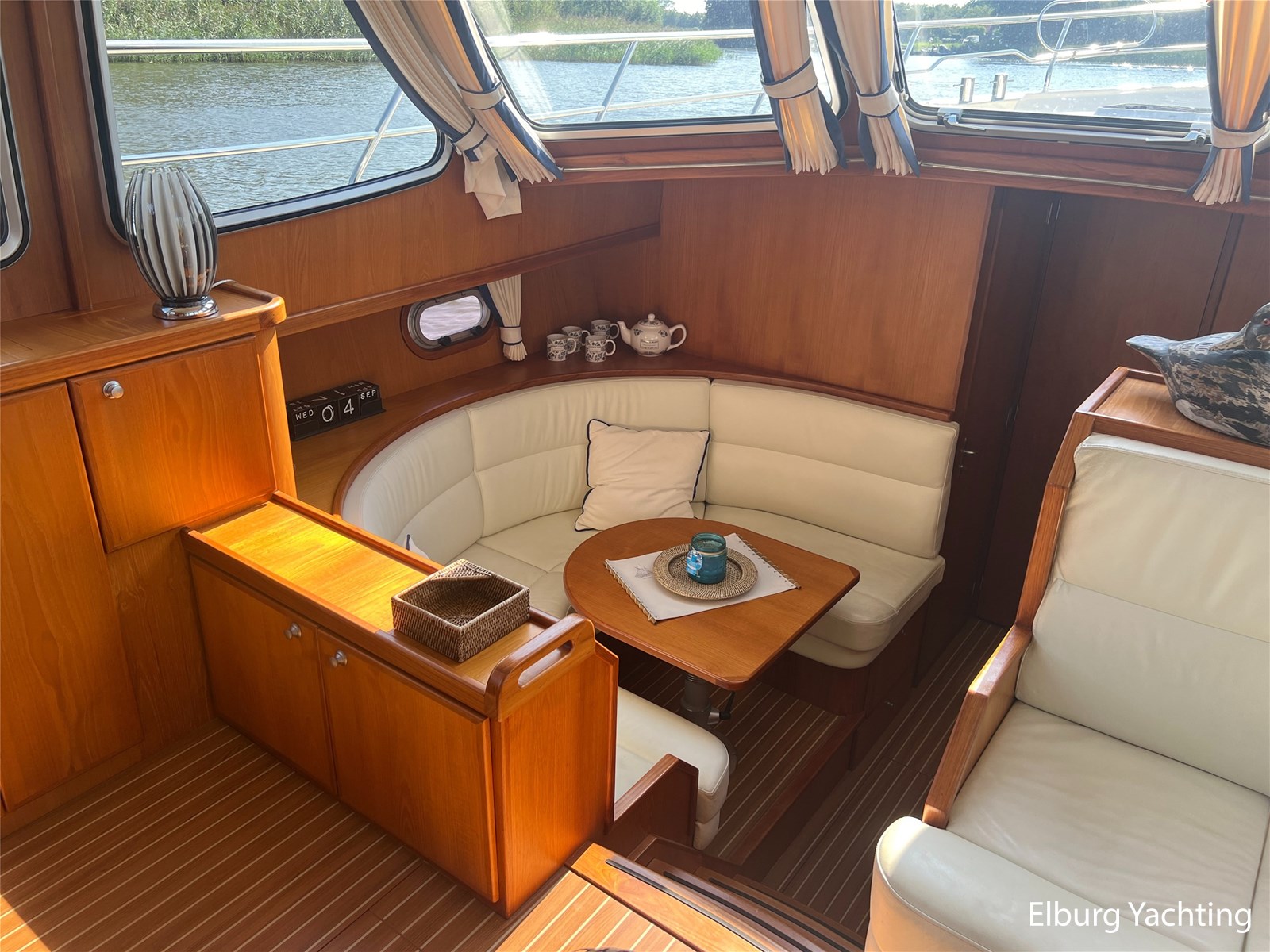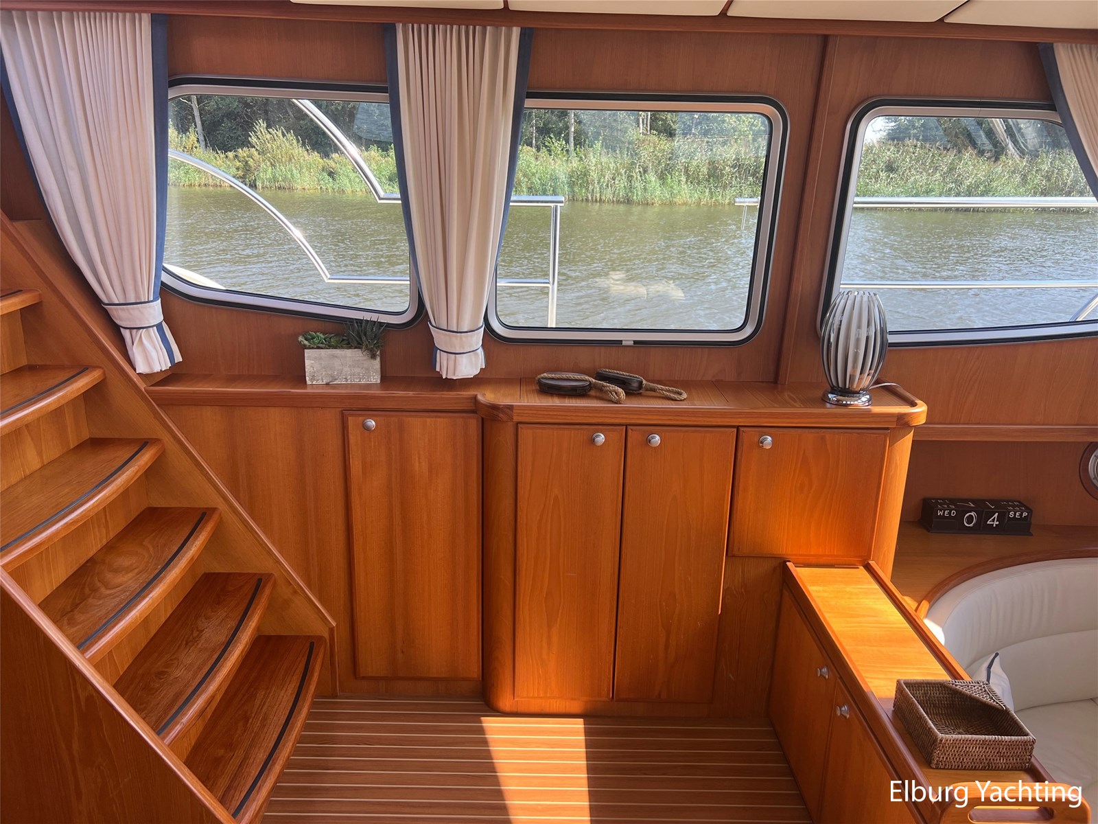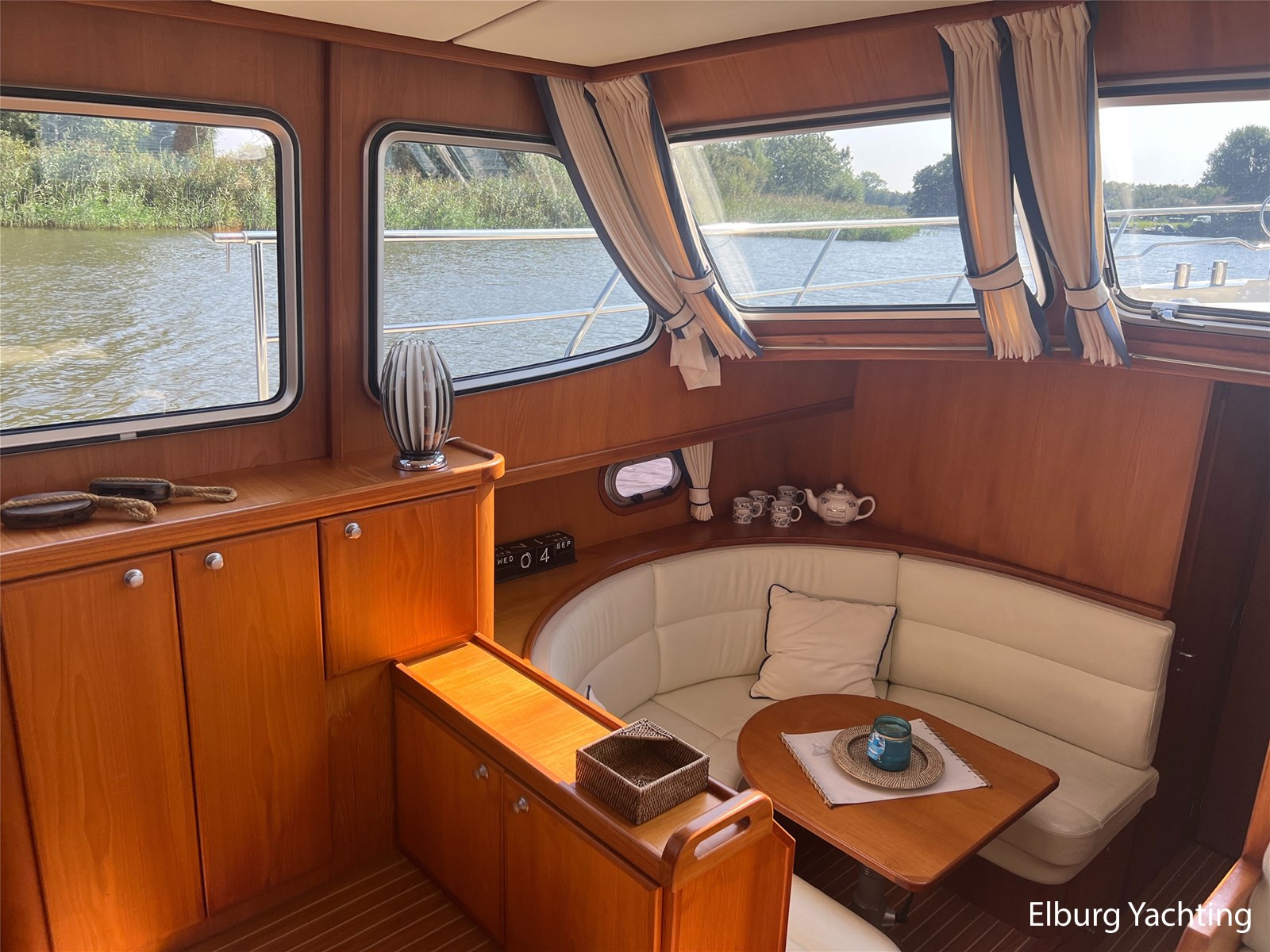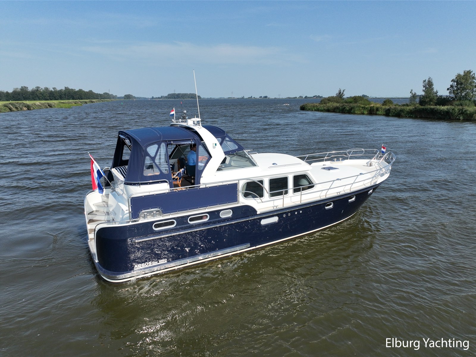 Deze Argos Line 12.50 wordt gekenmerkt door haar grote leefruimte zowel aan dek als in het interieur. Het schip heeft een ruime u bank op het achterdek met een comfortabele zit. De tent is over het gehele achterdek afsluitbaar zodat er ook met minder weer comfortabel buiten gezeten kan worden in combinatie met de uitblaasopeningen van de verwarming. De ramen in de tent zijn in 2024 vervangen. Daarnaast beschikt het schip over twee zeer ruime luie trappen naar het achterdek wat het zwemmen of op en afstappen erg vergemakkelijkt. Binnen is het schip uitgerust met een volwaardige salon, dinette en twee riante hutten met een vrijstaand bed en een frans bed. Verder wordt dit schip geleverd met o.a: r.v.s. bolders, ruime gangboorden, 2 x uitsparing in reling voor gemakkelijk afstappen, separate r.v.s. trap om vanuit de reling op laaggelegen steiger te komen, dubbele r.v.s. reling rondom, klapbare beugel, stalen gangboorden, overzichtelijk dashboard, ruim opgezet interieur, 3 x ruitenwissers, verlaagbare tafel in dinette voor extra te creëren slaapmogelijkheid, dubbel glas, vanaf boven de waterlijn volledig geisoleerd, raam in spiegel eigenaarshut, muggenhorren, separate douche, dubbele dynamo. Voor vragen en/of het maken van een afspraak bent u 7 dagen per week van harte welkom bij Elburg Yachting.