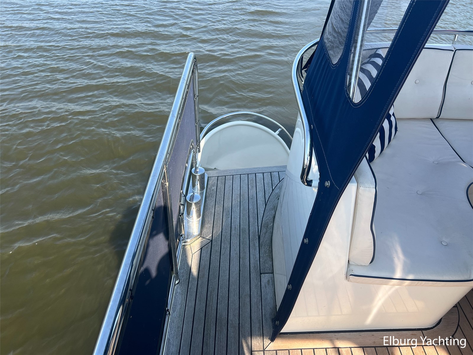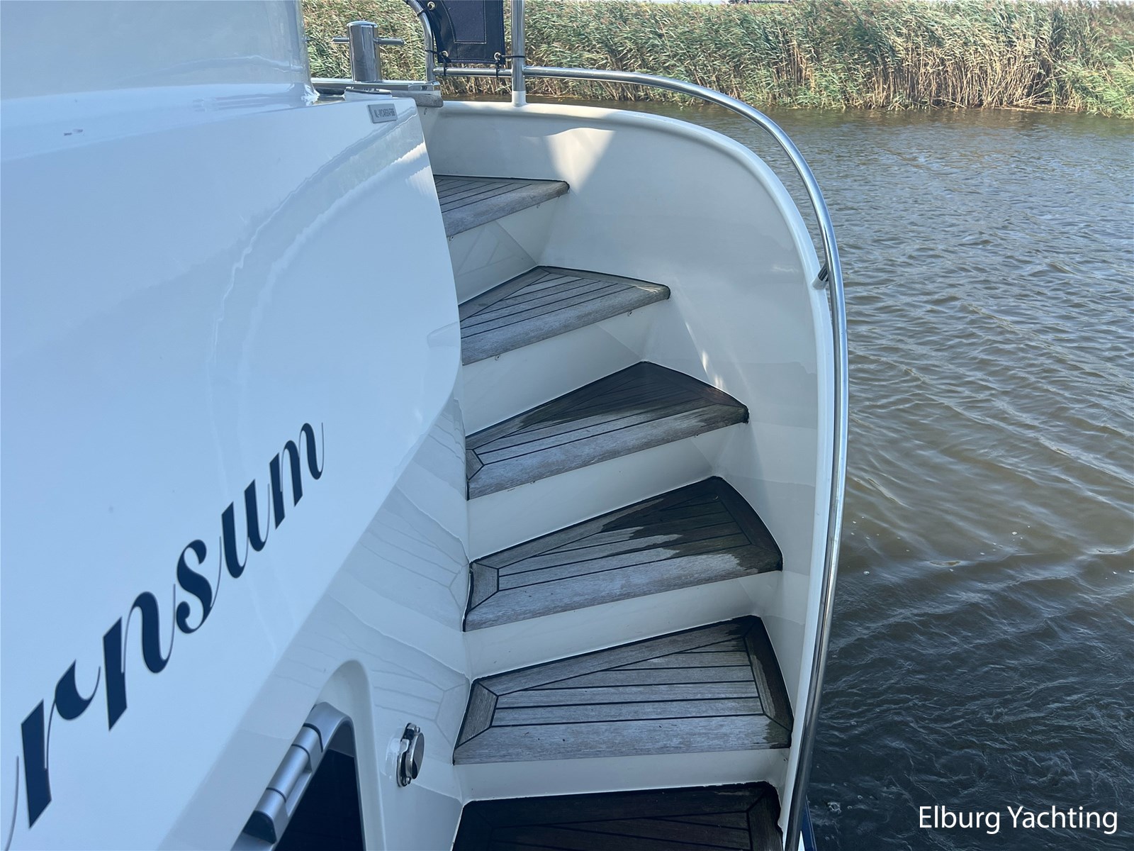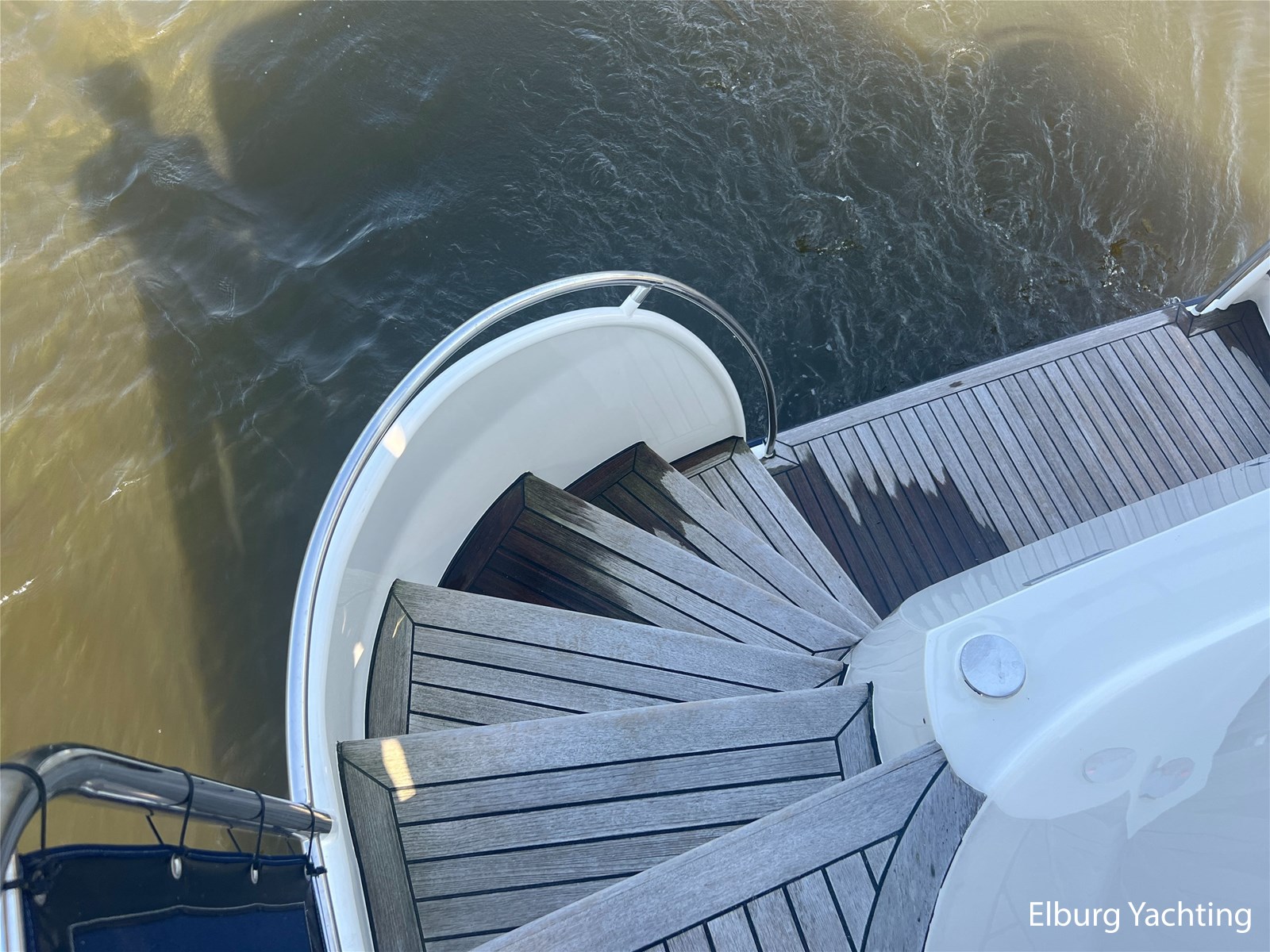 Geïntegreerd en ingelegd met teak + ruime dubbele ronde trappen + zwemtrap