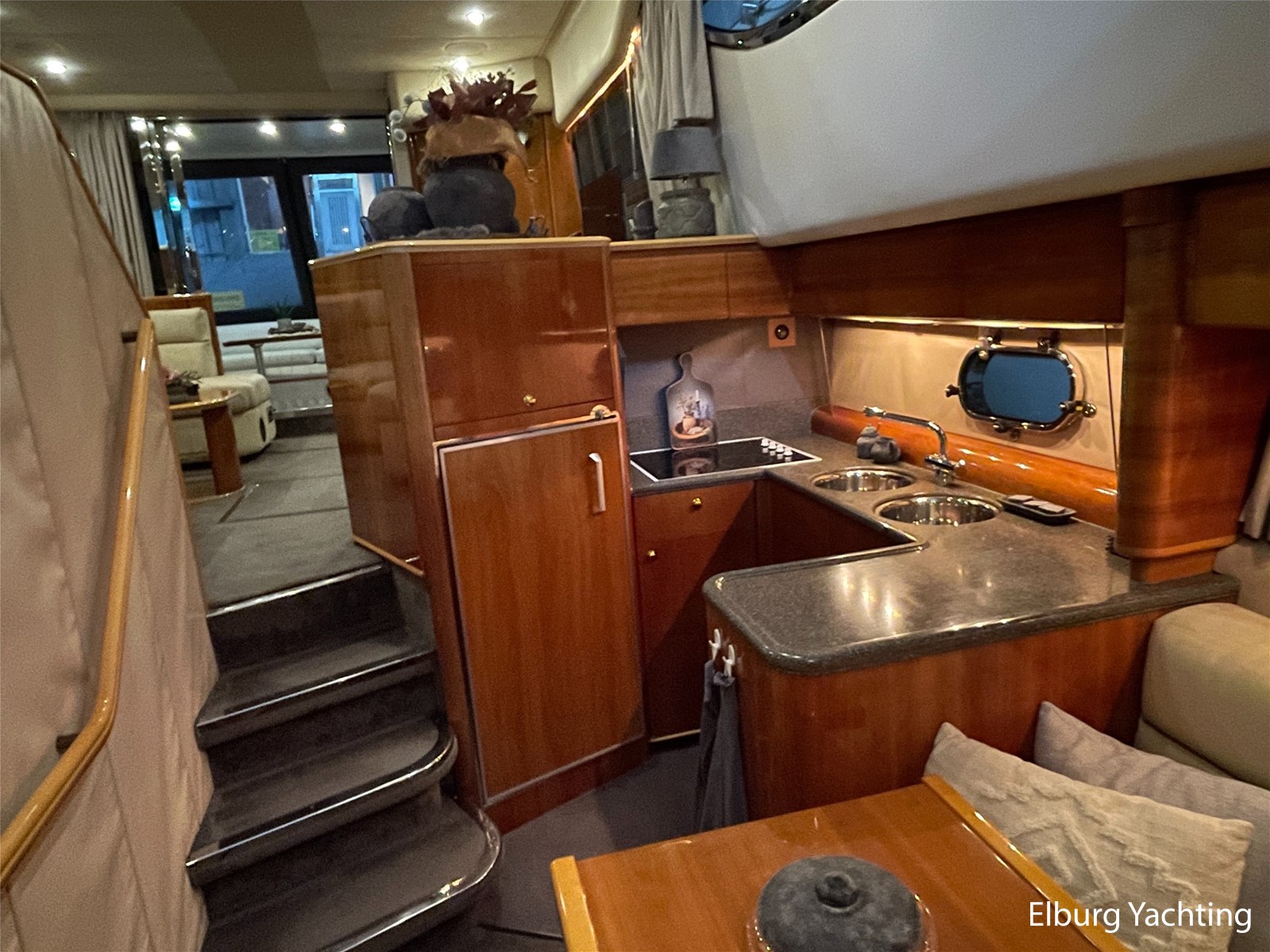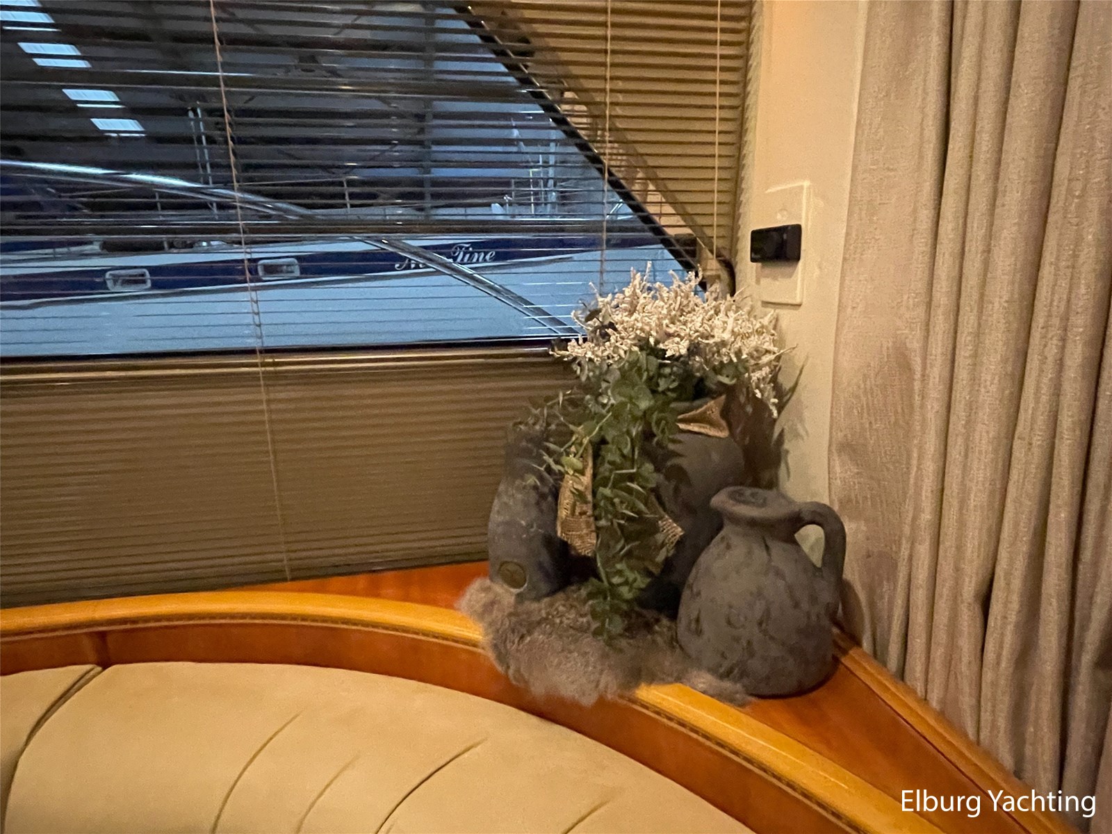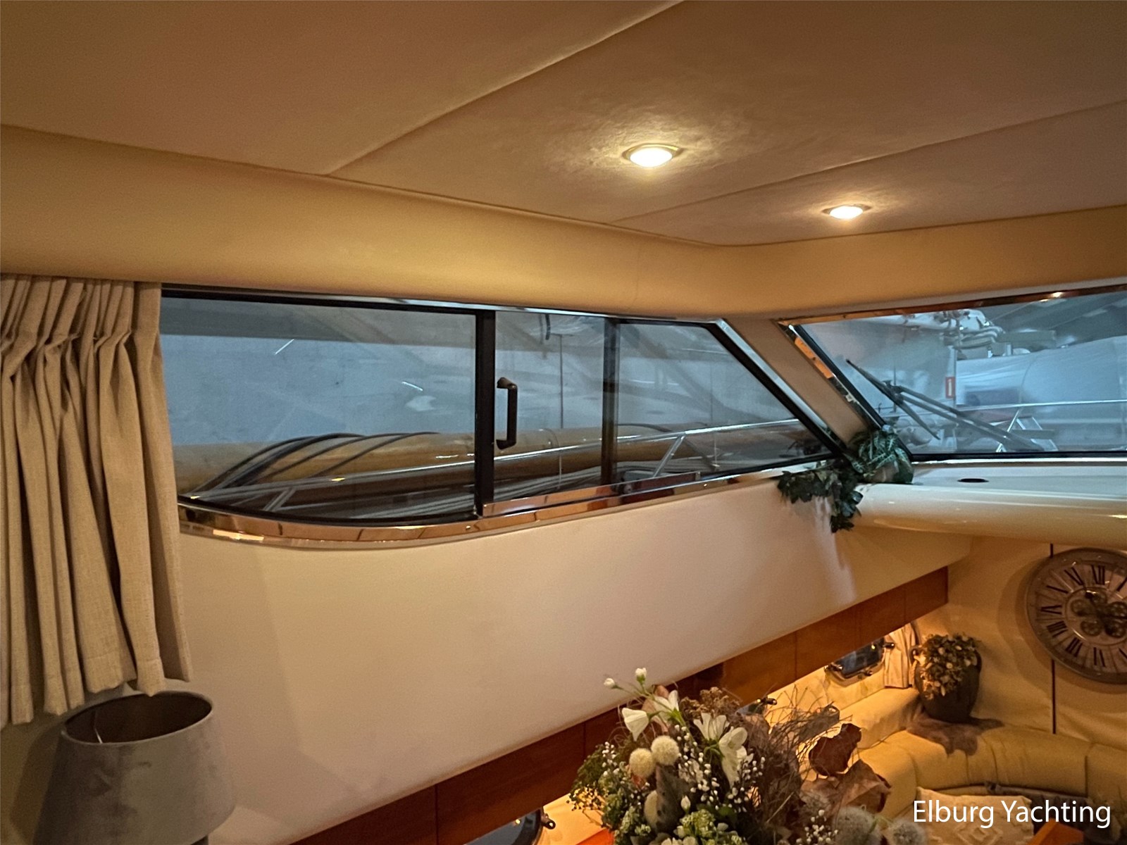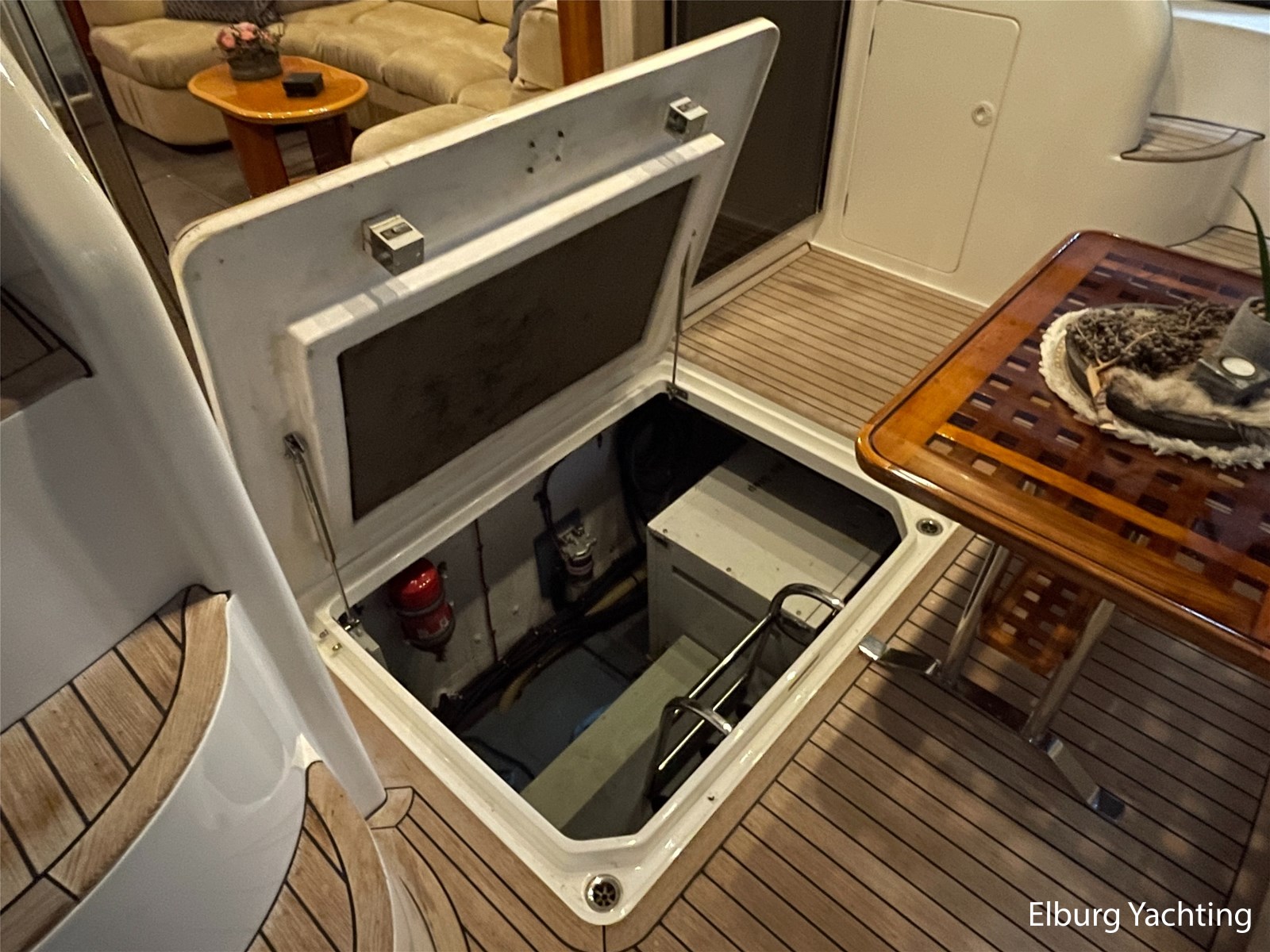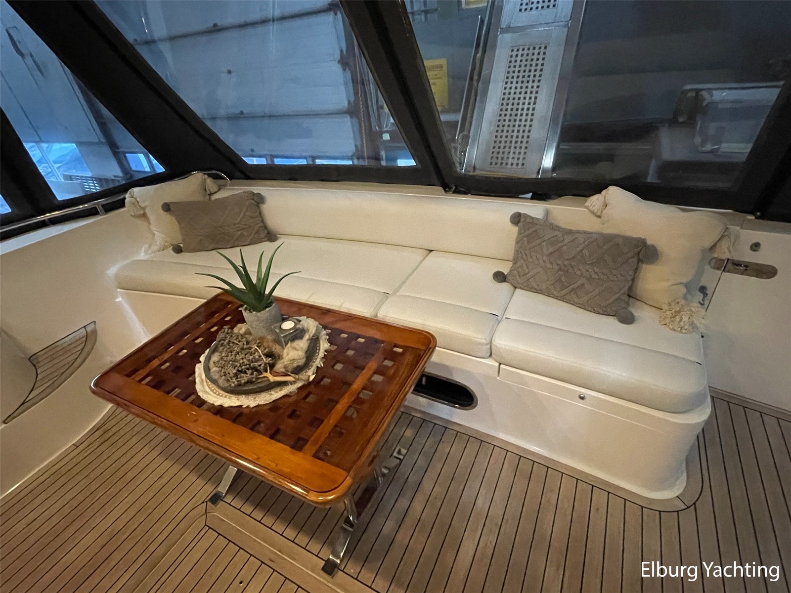 Prachtige Princess 480 Flybridge welke voorzien is van een zeer open en lichte salon / dinette indeling, twee comfortabele hutten en een ruime bering in het achterschip. Beide hutten hebben een 2-persoons bed met allebei toegang tot een eigen douche/toilet ruimte. Deze Princess 480 is uitgevoerd met: Vaste zitbank in open kuip met bijbehorende buitenkussens, de open kuip en salon gelijkvloers beloopbaar, r.v.s. schuifdeur naar salon, "luie" vaste trap naar flybridge, zonnebed op voordek, 2-persoons vaarbank op flybridge, trim tabs, volledige afsluitbare tent rondom kuip met uitristbare delen, r.v.s. buitenreling rondom, 2 x schuifraam in salon, biminitop op flybridge met afdekhoes 2024, buitendouche, ijsblokjesmachine, deur in spiegel naar zwemplatform, toegang machinekamer vanuit de open kuip en via salonvloer, zonneschermen rondom salonramen 2023, gordijnen in de salon vernieuwd in 2023. De verstuivers van de motoren zijn in 2024 gereviseerd, nieuwe antifouling + anode's 2024, nieuwe wasmachine 2024, nieuwe Eberspächer kachel 2024, nieuwe achtertent 2024, nieuwe biminihoes 2024 en zijn in 2023 beide dieseltanks gereinigd.