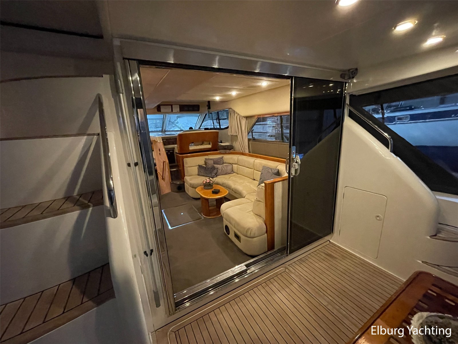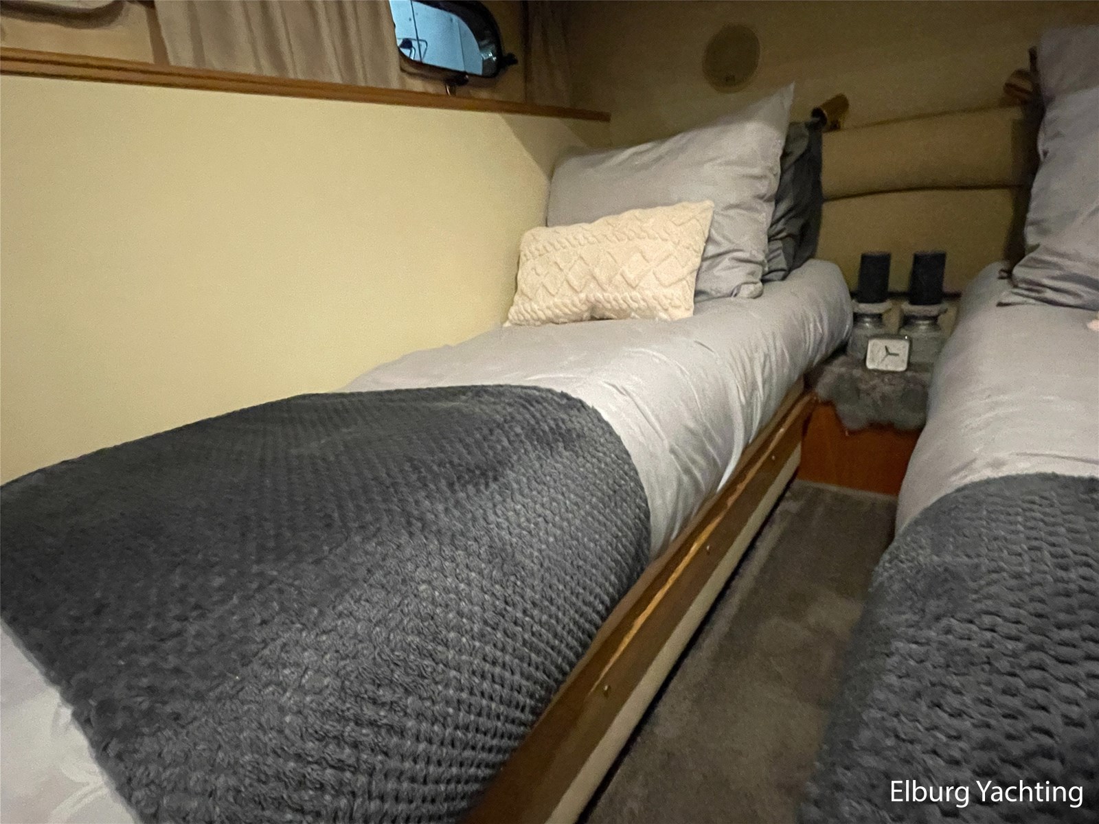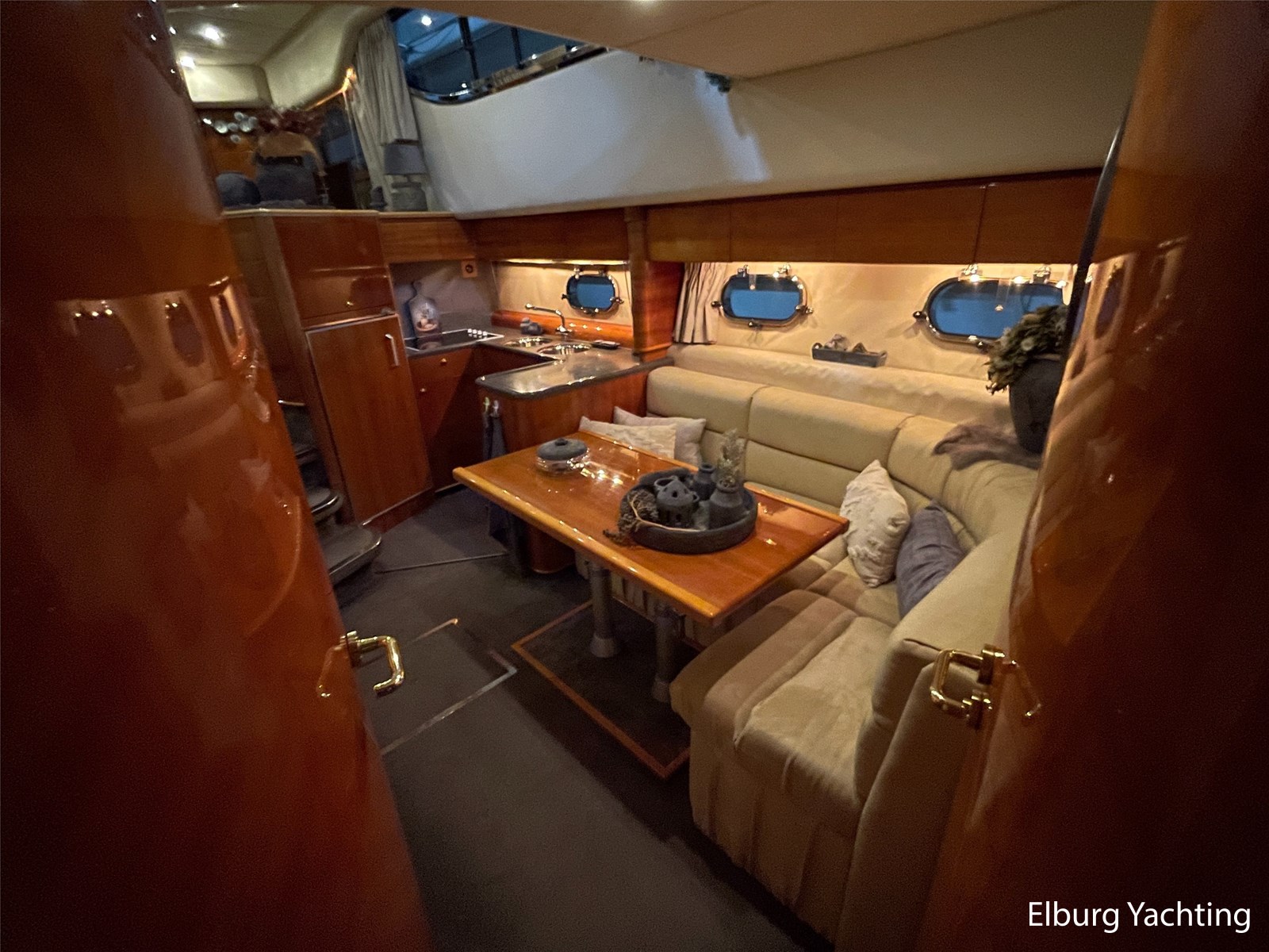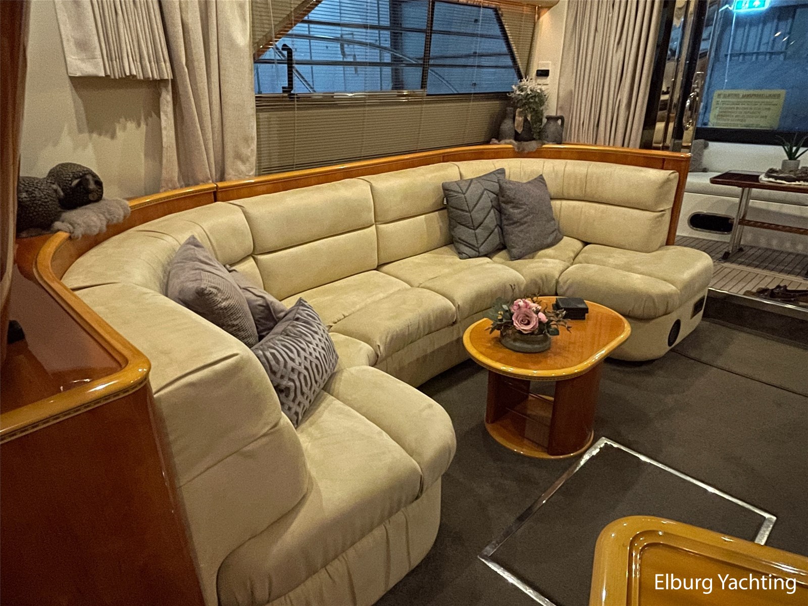 Prachtige Princess 480 Flybridge welke voorzien is van een zeer open en lichte salon / dinette indeling, twee comfortabele hutten en een ruime bering in het achterschip. Beide hutten hebben een 2-persoons bed met allebei toegang tot een eigen douche/toilet ruimte. Deze Princess 480 is uitgevoerd met: Vaste zitbank in open kuip met bijbehorende buitenkussens, de open kuip en salon gelijkvloers beloopbaar, r.v.s. schuifdeur naar salon, "luie" vaste trap naar flybridge, zonnebed op voordek, 2-persoons vaarbank op flybridge, trim tabs, volledige afsluitbare tent rondom kuip met uitristbare delen, r.v.s. buitenreling rondom, 2 x schuifraam in salon, biminitop op flybridge met afdekhoes 2024, buitendouche, ijsblokjesmachine, deur in spiegel naar zwemplatform, toegang machinekamer vanuit de open kuip en via salonvloer, zonneschermen rondom salonramen 2023, gordijnen in de salon vernieuwd in 2023. De verstuivers van de motoren zijn in 2024 gereviseerd, nieuwe antifouling + anode's 2024, nieuwe wasmachine 2024, nieuwe Eberspächer kachel 2024, nieuwe achtertent 2024, nieuwe biminihoes 2024 en zijn in 2023 beide dieseltanks gereinigd.