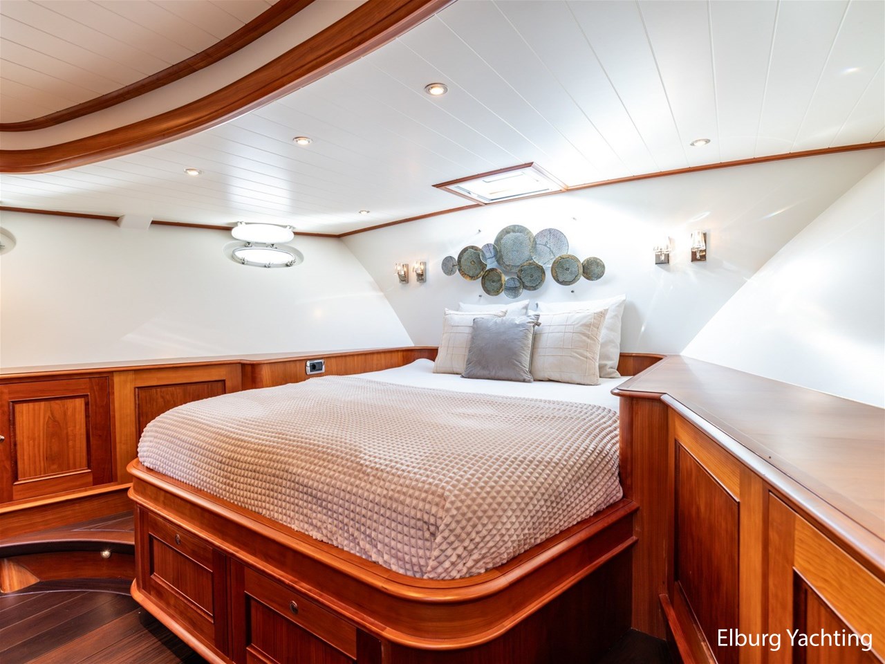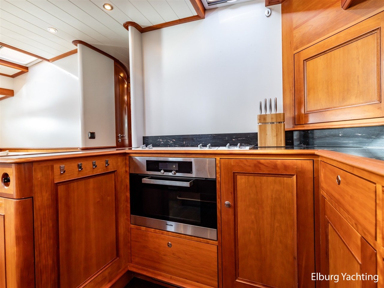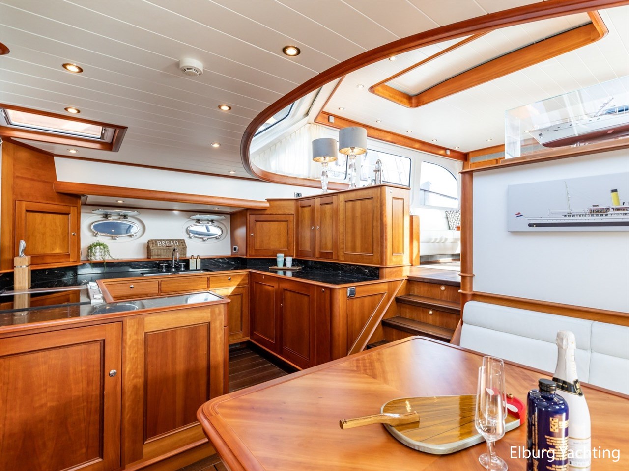 Het jacht beschikt over een ruime keuken en een zeer ruime U-vormige dinette tegenover de keuken. De eigenaarshut is ontworpen met oog voor detail en comfort. Het is een ruime hut met ensuite een badkamer, en biedt een royale inloopruimte incl. een bureau met veel kastruimte voordat de slaapruimte wordt betreedt Het interieur heeft prachtig gebogen deuropeningen en deuren, die de traditionele en klassieke charme benadrukken, terwijl de moderne accenten in het jacht haar veelzijdigheid onderstrepen.