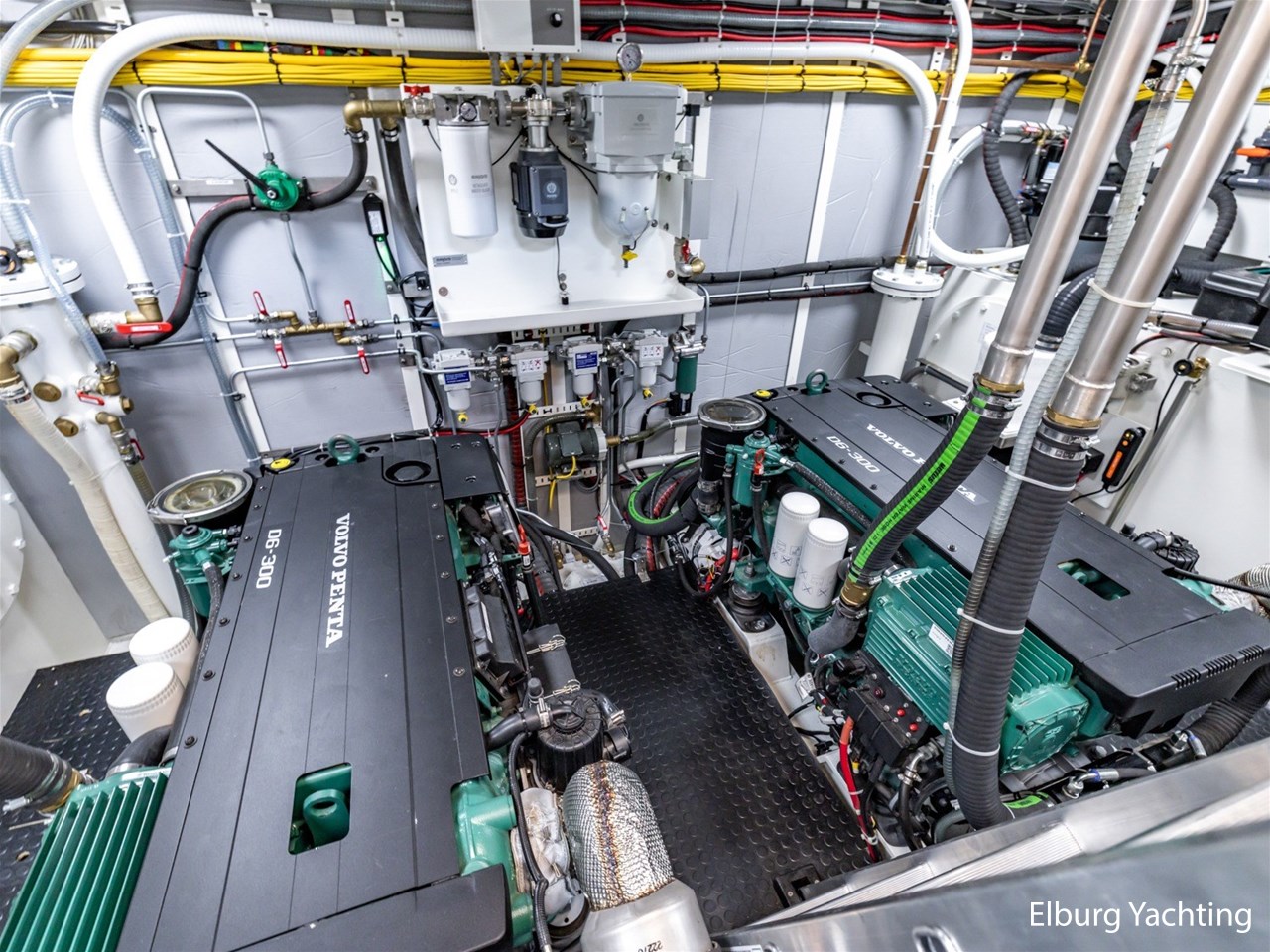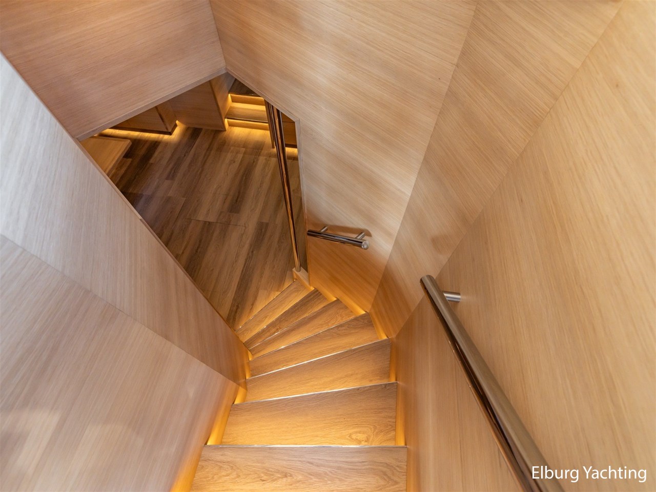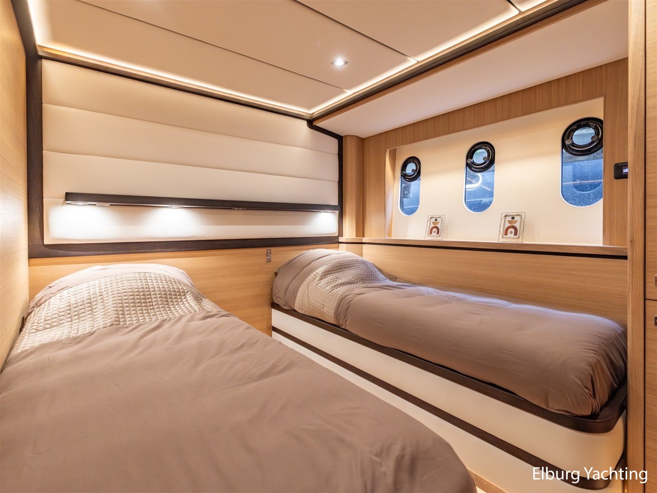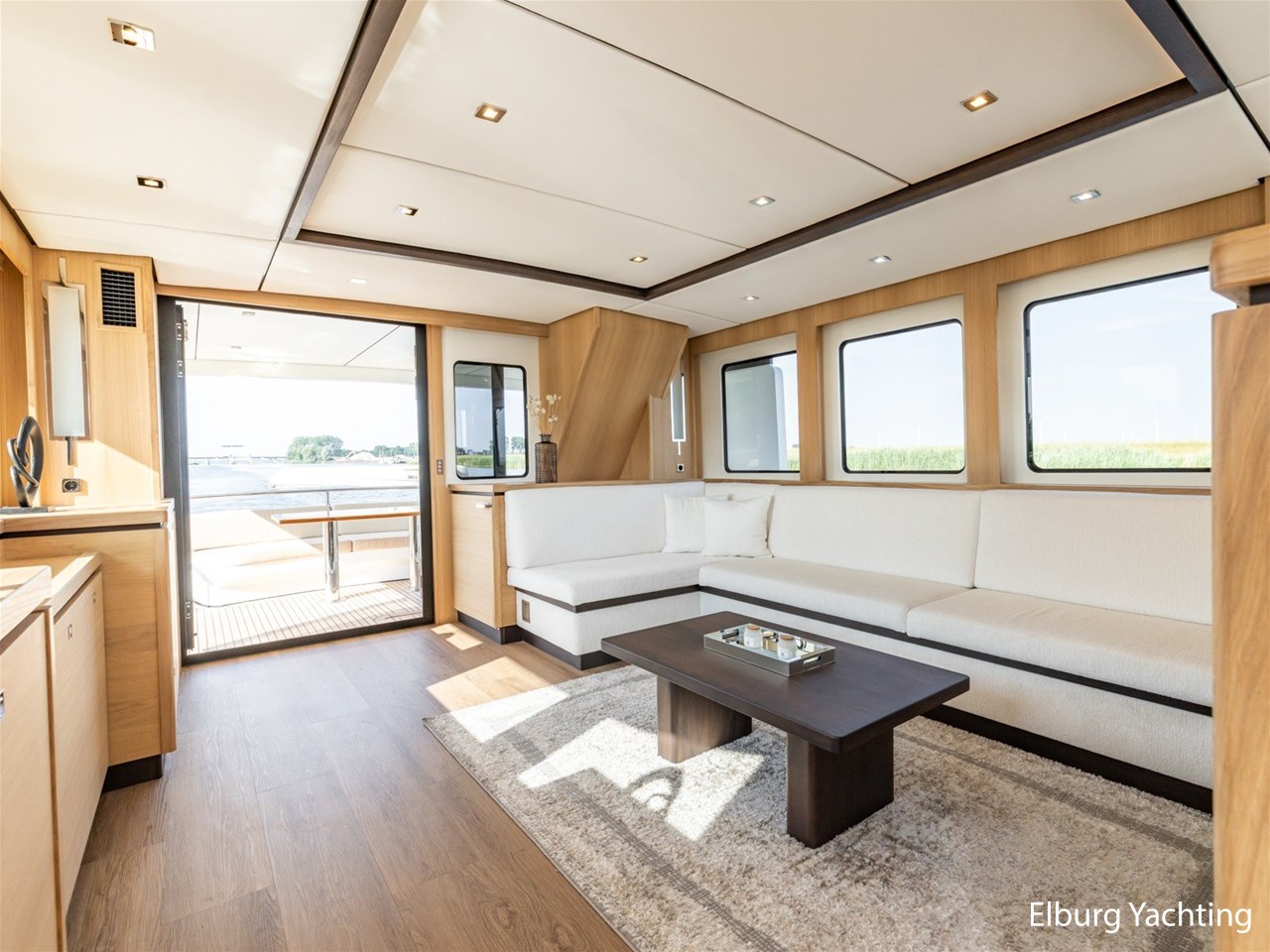 Aan boord valt direct het oog voor ruimte en design op. Het jacht is zeer ruimtelijk vormgegeven met veel hoogte (stahoogte salon ruim 2 meter). Het moderne eiken interieur in combinatie met de p.v.c. vloer (voorzien van vloerverwarming) is vakkundig tot stand gekomen en zorgt voor een aangename omgeving. Naast de centrale verwarming is het jacht voorzien van airconditioning in alle hutten, de salon en het stuurhuis. Het jacht beschikt over drie volwaardige hutten met in de eigenaarshut een ruim dubbel vrijstaand bed en on suite badkamer (lengte ca. 2 meter), aan bakboord twee enkele bedden (lengte ca. 2 meter) en aan stuurboord een ruim dubbel bed (lengte ca. 2 meter) + een enkel bed.