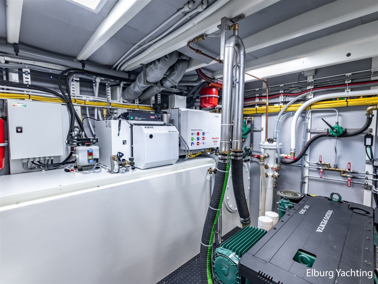 De ruime machinekamer is overzichtelijk ingericht en op twee manieren toegankelijk, zowel van binnen als van buiten. Achter de machinekamer is een handige extra ruimte gecreëerd waar de wasmachine/ droger geplaatst is en diverse spullen opgeborgen kunnen worden (toegankelijk vanuit machinekamer als vanaf het zwemplateau).