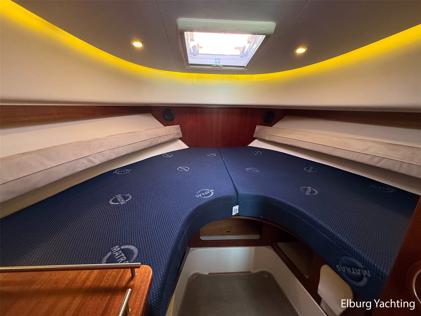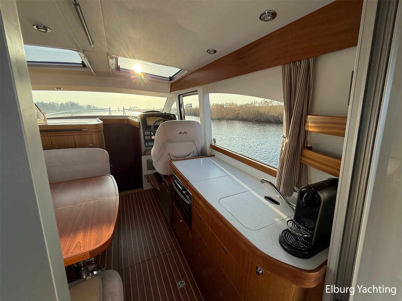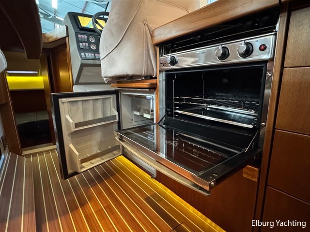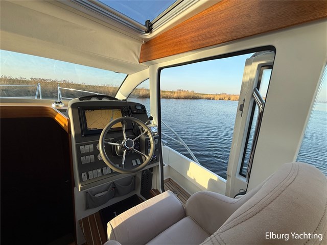 De Nimbus 335 beschikt over een ruime en verzorgde kuip, waarin comfort en functionaliteit mooi samenkomen. De zitbank met kussens nodigt uit tot ontspannen momenten aan boord, terwijl de diepe opbergbak praktische bergruimte biedt. Dankzij de volledig afsluitbare kuiptent is deze buitenruimte ook bij minder weer een prettige plek om te verblijven. Via een gemakkelijke doorgang bereikt u het zwemplatform. De salon is bereikbaar via een schuifdeur en biedt aan stuurboordzijde de kombuis en de stuurstand. De stuurstand is voorzien van een handige deur naar het gangboord. Aan bakboord bevindt zich een comfortabele dinette met in hoogte verstelbare tafel. Voorin, tegenover de stuurstand, is een klapbare meevaarbank aanwezig met een uitschuifbare tv. De combinatie van mahoniehouten betimmering en lichte bekleding geeft het interieur een warme, stijlvolle Scandinavische uitstraling. In 2025 zijn onder andere het toilet, de radar, omvormer, marifoon, Fusion-radio en de matrassen vernieuwd. De warmtewisselaar is gereviseerd. In 2025 is het schip voorzien van nieuwe antifouling en is er een uitgebreide poets- en polijstbeurt uitgevoerd. De motor kreeg in 2025 een onderhoudsbeurt en de plotter werd vervangen in 2023. Grote luiken in de kuipvloer zorgen voor uitstekende toegang tot de motorruimte, bergruimte en technische installaties. Het gemiddeld brandstofverbruik (5-6 knopen varen) bedroeg circa 3 liter per uur. Met originele Nimbus-details zoals het servies, een chique dubbele RVS zeerailing en een doordachte indeling is dit jacht een compleet geheel. Volledige documentatie beschikbaar.