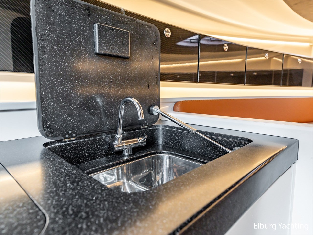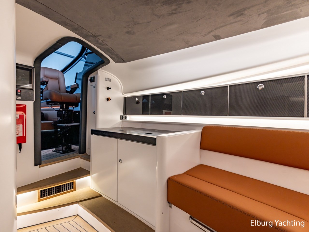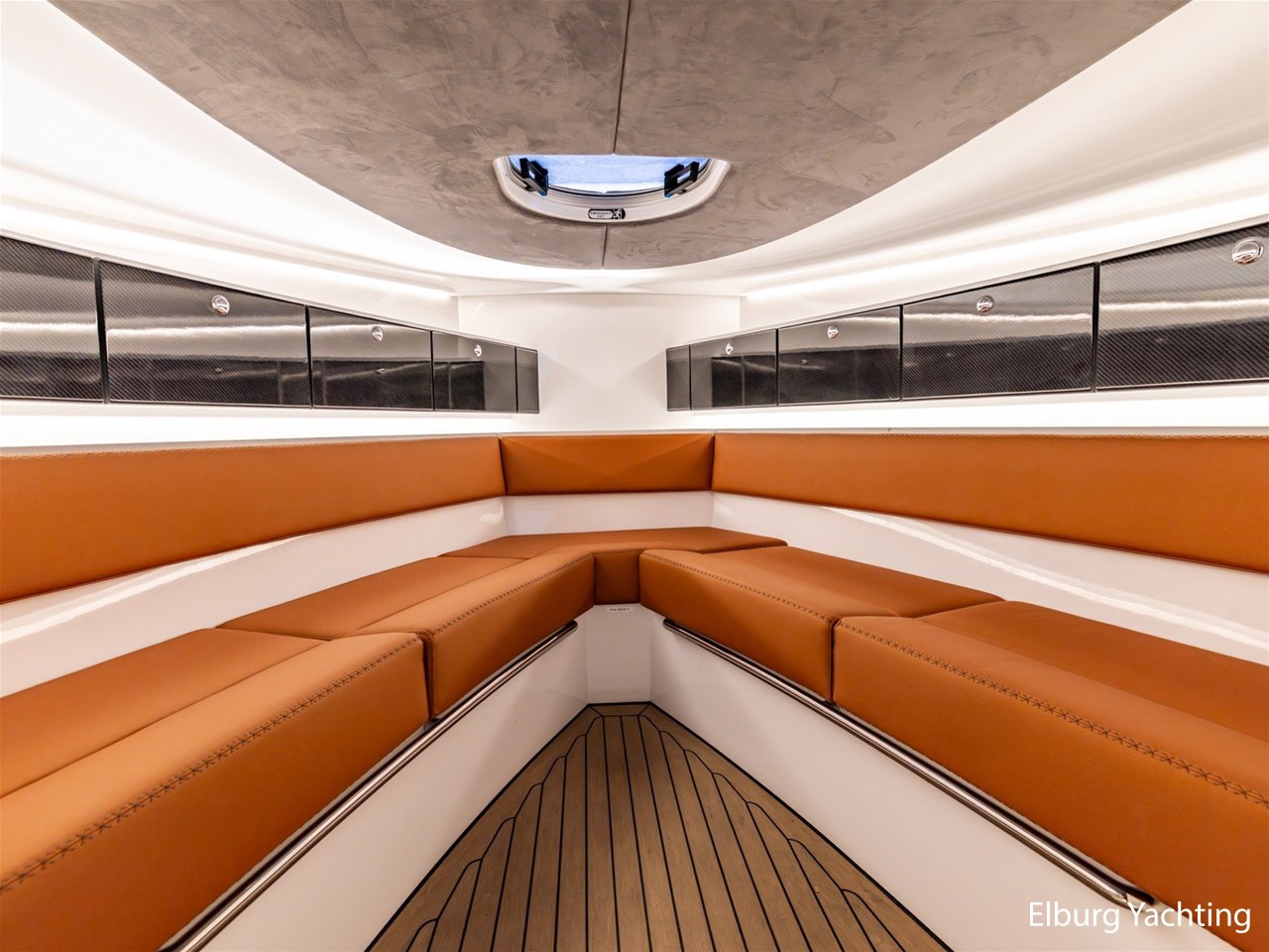 Wit gelakt met alcantara plafond bekleding en kunstteak vloeren