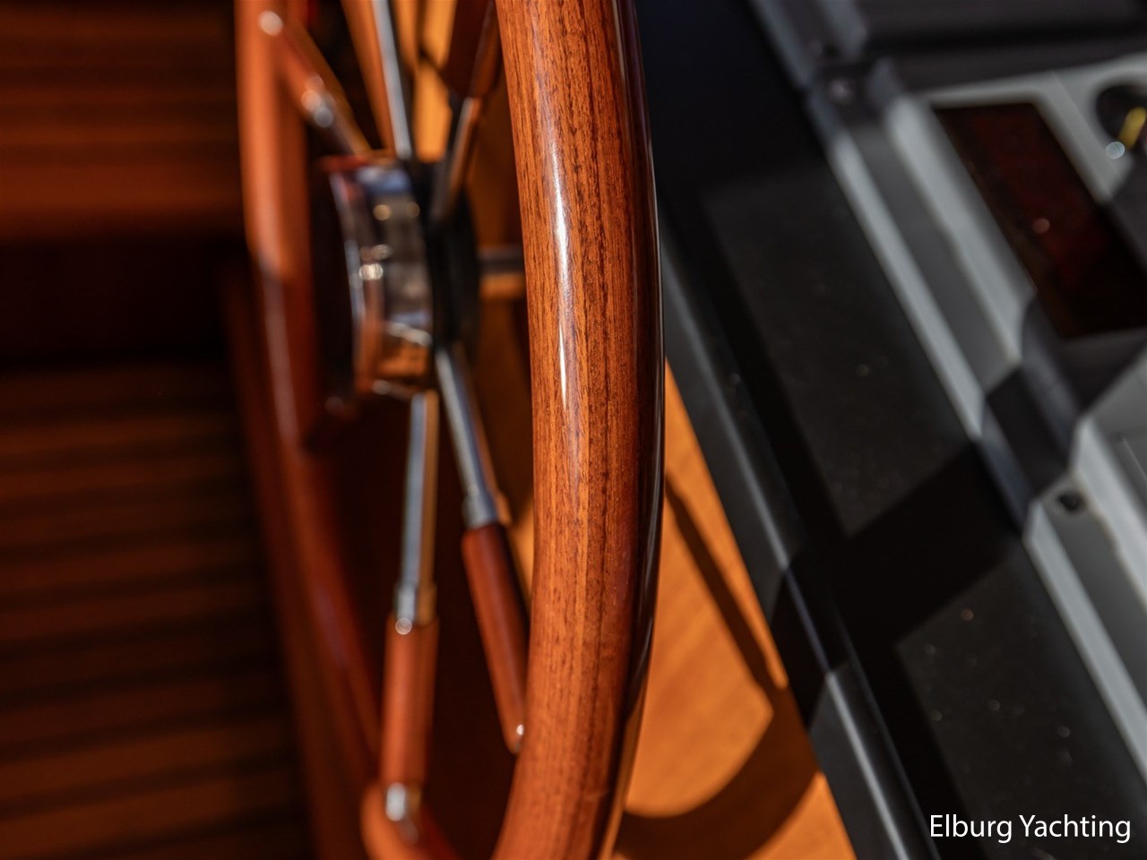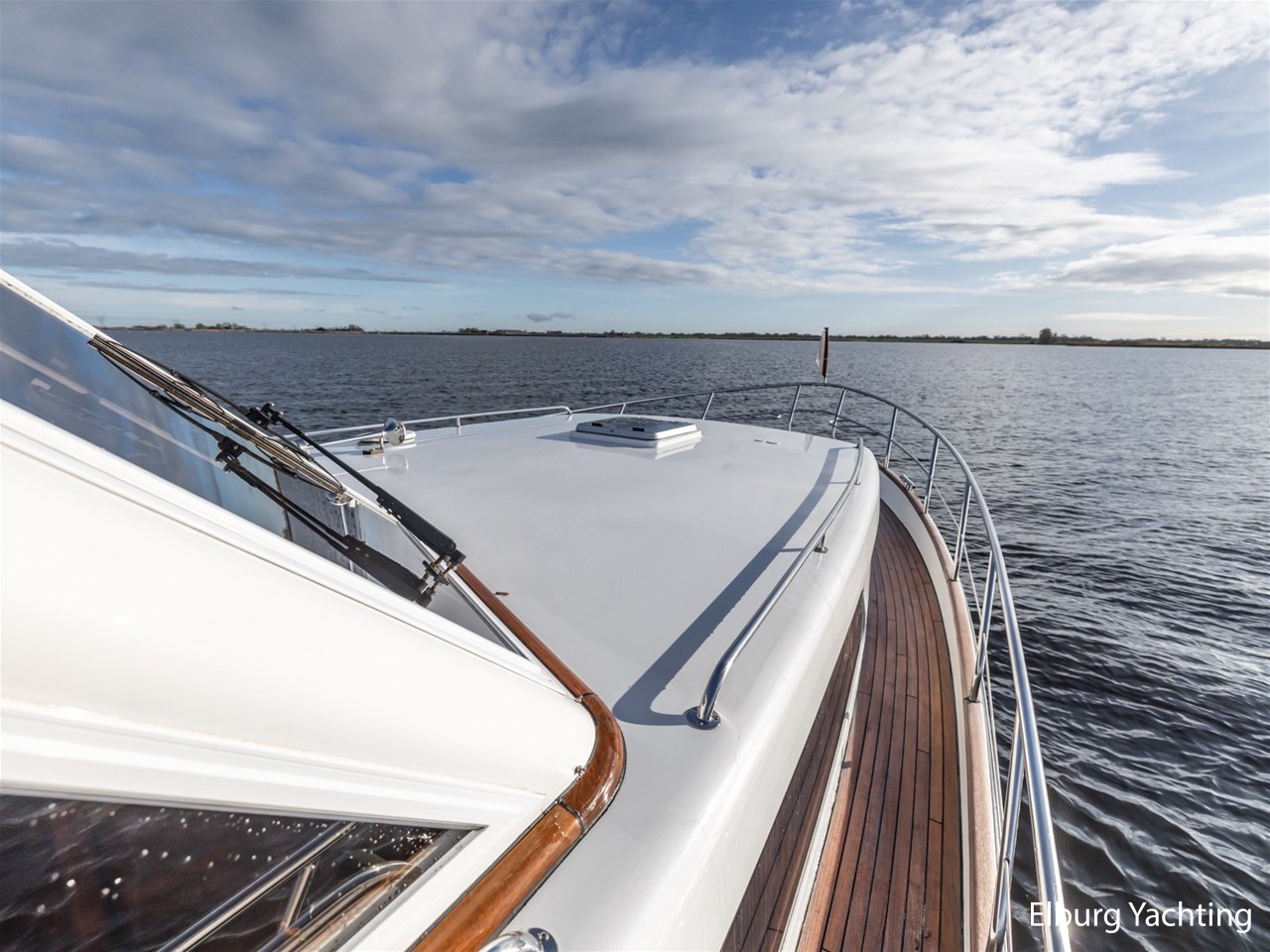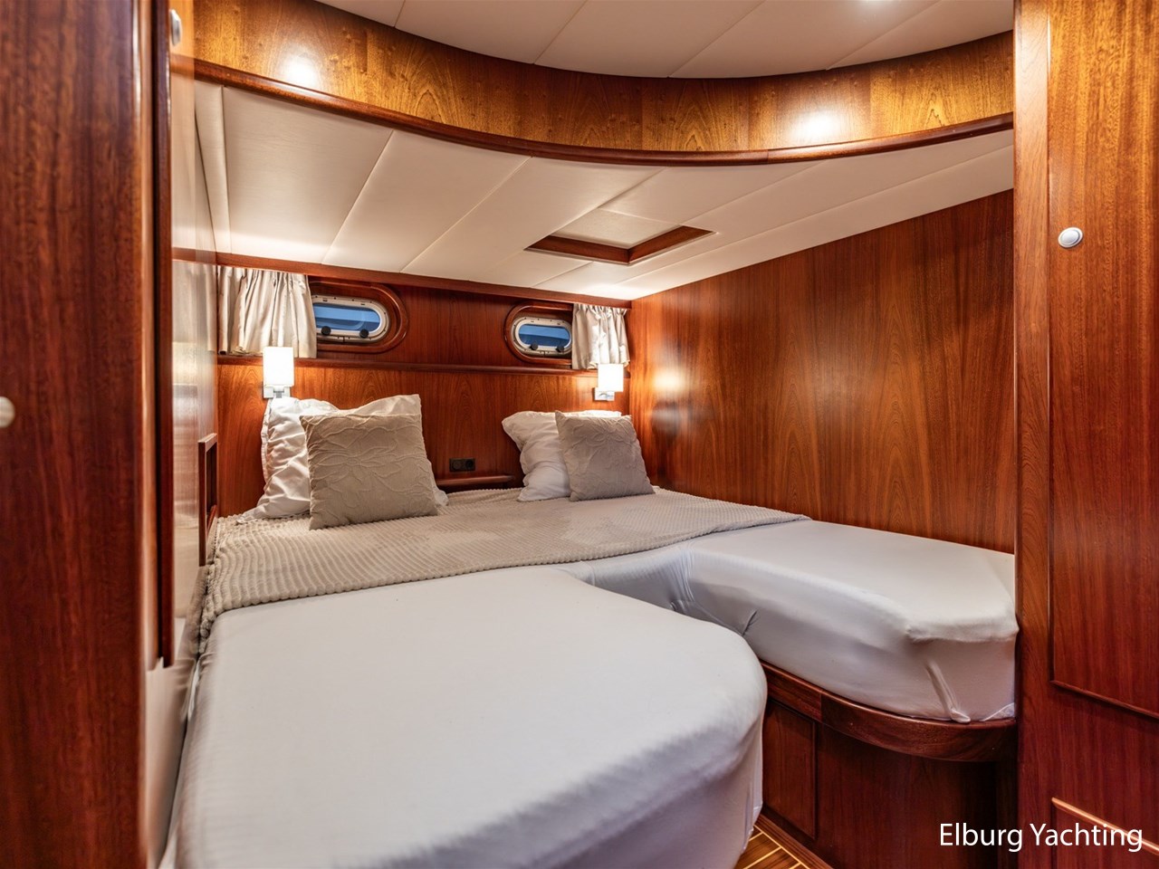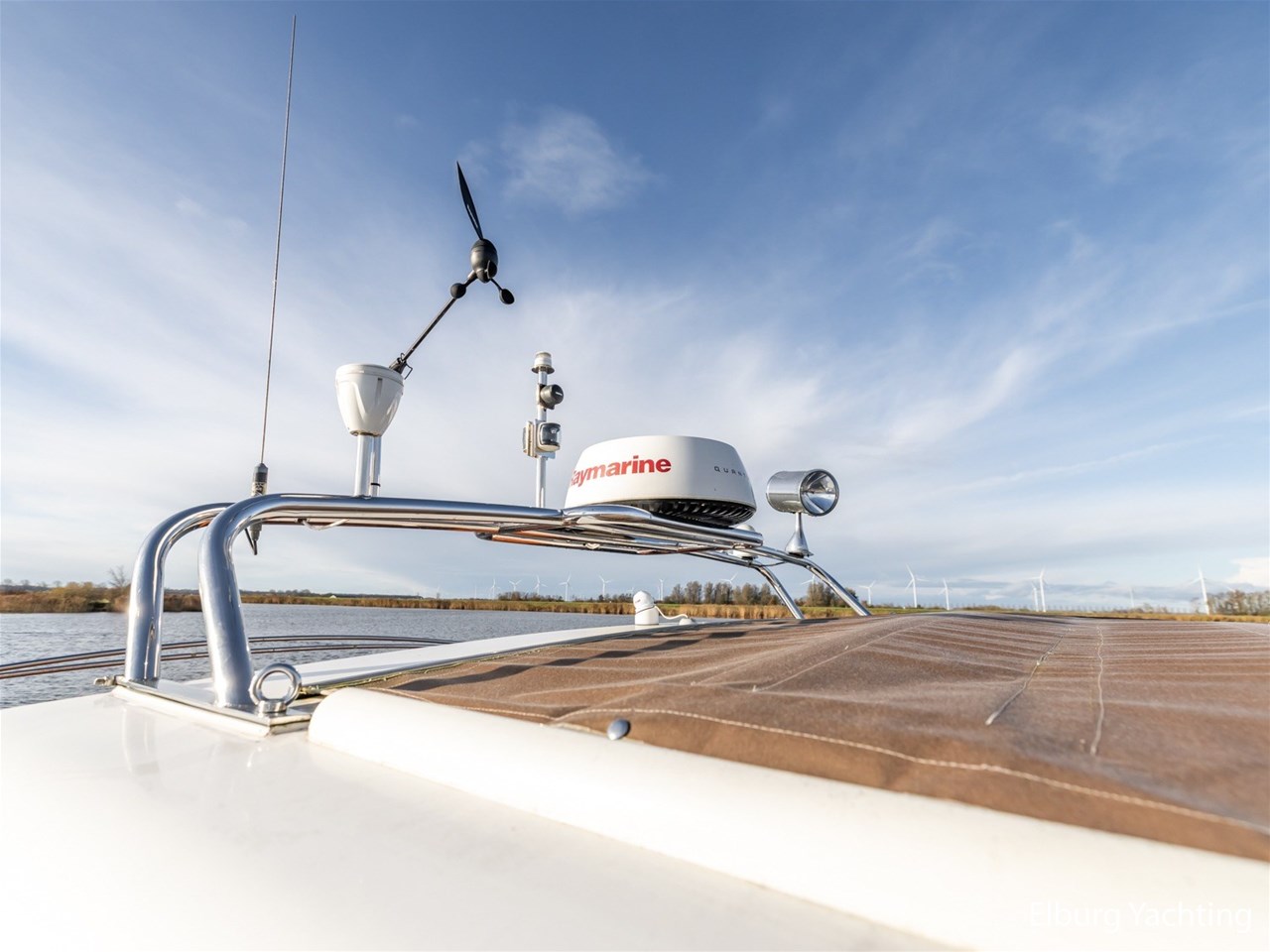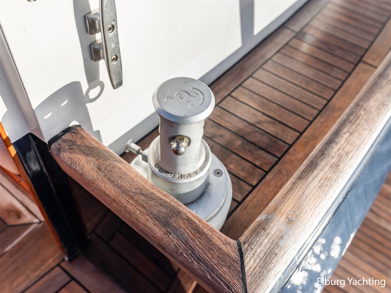 De Mulder Favorite 46 is een elegant en degelijk motorjacht, ontworpen door Guido de Groot en gebouwd door de gerenommeerde werf Mulder Shipyard. Dit jacht straalt tijdloze klasse uit en is ontworpen voor comfortabel en stijlvol verblijf aan boord. De ruime open kuip staat in directe verbinding met de salon en het stuurhuis, wat zorgt voor een open en lichte leefruimte. Het interieur is klassiek uitgevoerd in mahoniehout en voorzien van lichte, recent vernieuwde stoffering. Dankzij de twee hutten, elk met eigen sanitair, is het schip uitstekend geschikt voor langer verblijf aan boord. Tussen 2021 en 2025 is er breed geïnvesteerd in techniek, afwerking en uitrusting. Het teakdek is in 2023-2024 volledig vernieuwd door Jonker Jachtbouw. Het onderwaterschip is in diezelfde periode gestraald en behandeld met nieuwe antifouling. In 2023 is groot motoronderhoud uitgevoerd, inclusief de plaatsing van twee nieuwe turbo’s. In 2024 is aanvullende service aan de motoren uitgevoerd. Het jacht is voorzien van schroefassen en vierblads schroeven. De generator is in mei 2025 geserviced. De kruissnelheid bedraagt ca. 8 knopen bij 2500 rpm, met een maximale snelheid van ca. 11 knopen bij 3300 rpm. De economische vaarsnelheid ligt rond de ca. 7 knopen bij 2200 rpm. Qua uitrusting is het jacht voorzien van een uitgebreid en recent vernieuwd Raymarine-navigatiesysteem met onder andere twee Axiom 12” displays, radar, AIS, GPS, autopilot met afstandsbediening, VHF, windmeter en een camera op de radarboog. In 2023-2024 is er een nieuwe hekschroef met afstandsbediening aangebracht, naast de bestaande boegschroef. De kussens op het voordek zijn aanwezig en in 2023-2024 vernieuwd. Verder is het jacht uitgerust met RVS fenderhouders en een zoeklicht. Volledige documentatie van de werkzaamheden is op aanvraag beschikbaar. Voor vragen en/of het maken van een afspraak bent u 7 dagen per week van harte welkom bij Elburg Yachting.