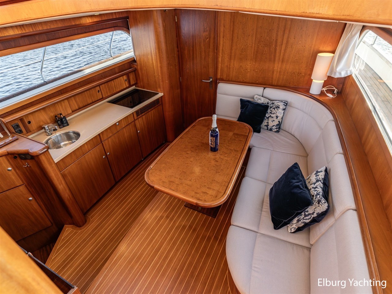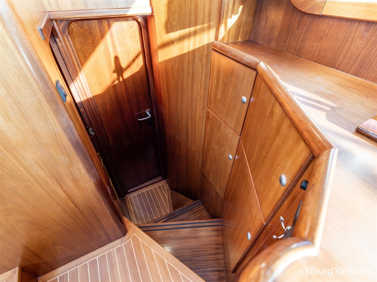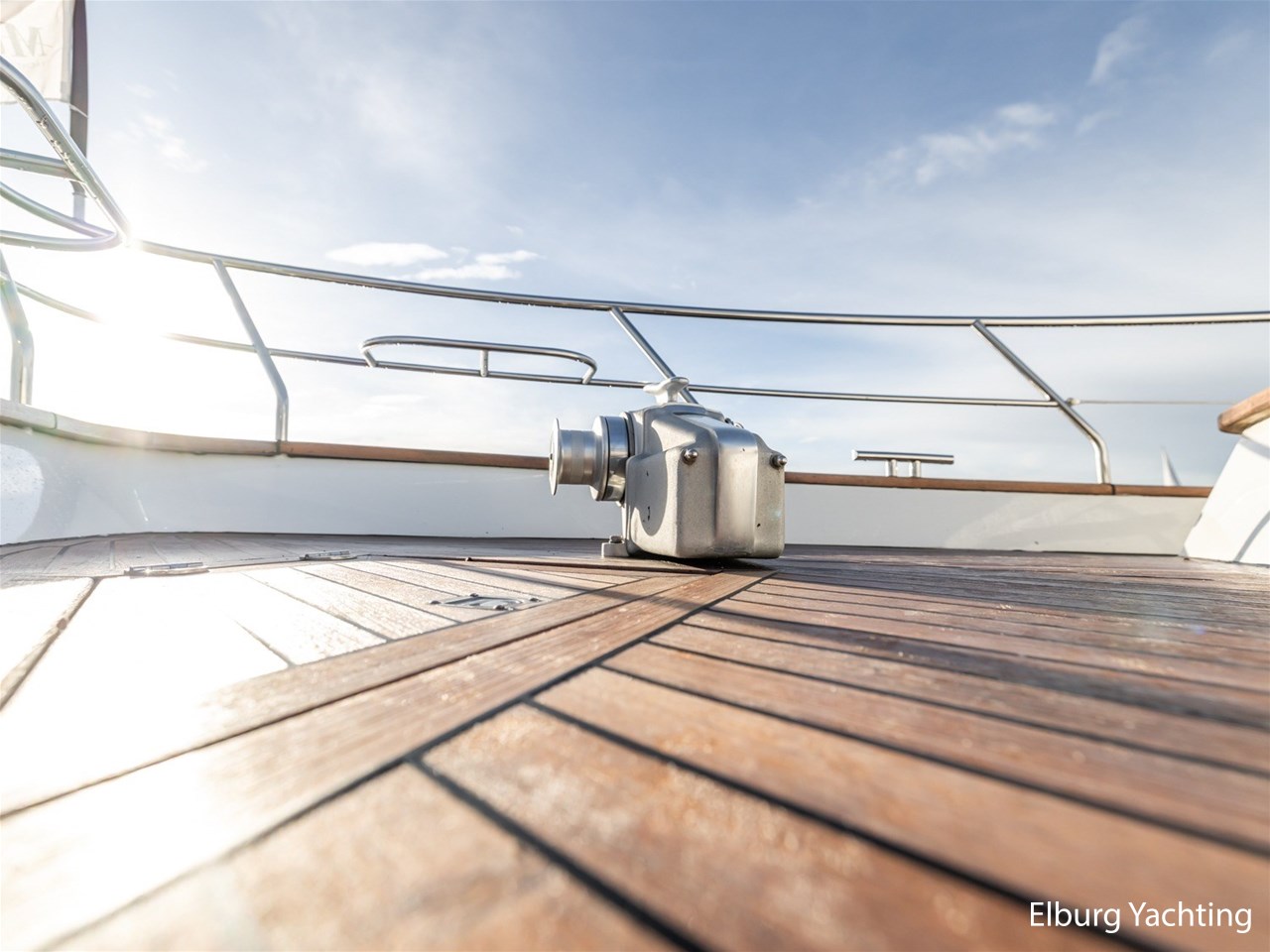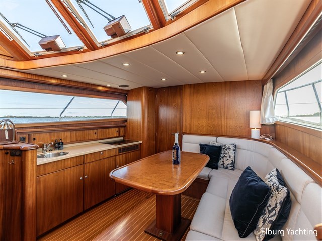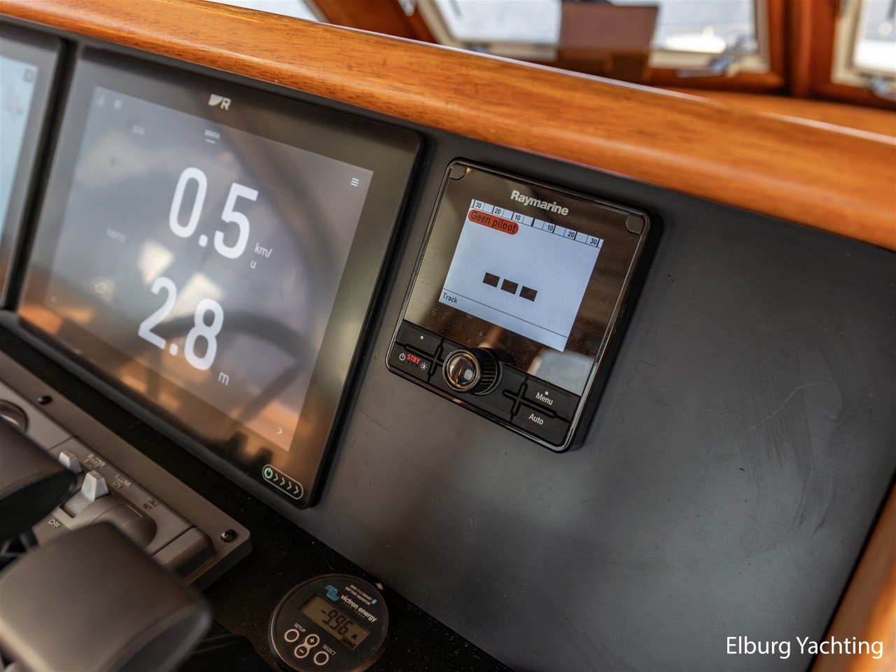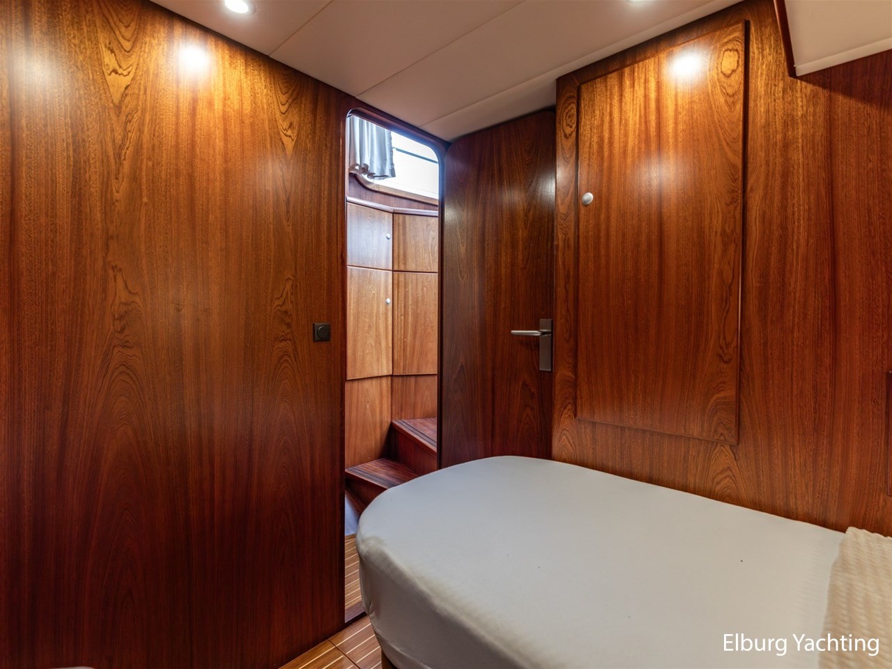 De Mulder Favorite 46 is een elegant en degelijk motorjacht, ontworpen door Guido de Groot en gebouwd door de gerenommeerde werf Mulder Shipyard. Dit jacht straalt tijdloze klasse uit en is ontworpen voor comfortabel en stijlvol verblijf aan boord. De ruime open kuip staat in directe verbinding met de salon en het stuurhuis, wat zorgt voor een open en lichte leefruimte. Het interieur is klassiek uitgevoerd in mahoniehout en voorzien van lichte, recent vernieuwde stoffering. Dankzij de twee hutten, elk met eigen sanitair, is het schip uitstekend geschikt voor langer verblijf aan boord. Tussen 2021 en 2025 is er breed geïnvesteerd in techniek, afwerking en uitrusting. Het teakdek is in 2023-2024 volledig vernieuwd door Jonker Jachtbouw. Het onderwaterschip is in diezelfde periode gestraald en behandeld met nieuwe antifouling. In 2023 is groot motoronderhoud uitgevoerd, inclusief de plaatsing van twee nieuwe turbo’s. In 2024 is aanvullende service aan de motoren uitgevoerd. Het jacht is voorzien van schroefassen en vierblads schroeven. De generator is in mei 2025 geserviced. De kruissnelheid bedraagt ca. 8 knopen bij 2500 rpm, met een maximale snelheid van ca. 11 knopen bij 3300 rpm. De economische vaarsnelheid ligt rond de ca. 7 knopen bij 2200 rpm. Qua uitrusting is het jacht voorzien van een uitgebreid en recent vernieuwd Raymarine-navigatiesysteem met onder andere twee Axiom 12” displays, radar, AIS, GPS, autopilot met afstandsbediening, VHF, windmeter en een camera op de radarboog. In 2023-2024 is er een nieuwe hekschroef met afstandsbediening aangebracht, naast de bestaande boegschroef. De kussens op het voordek zijn aanwezig en in 2023-2024 vernieuwd. Verder is het jacht uitgerust met RVS fenderhouders en een zoeklicht. Volledige documentatie van de werkzaamheden is op aanvraag beschikbaar. Voor vragen en/of het maken van een afspraak bent u 7 dagen per week van harte welkom bij Elburg Yachting.