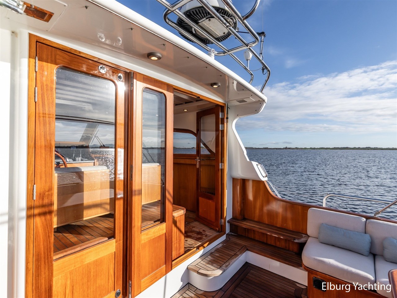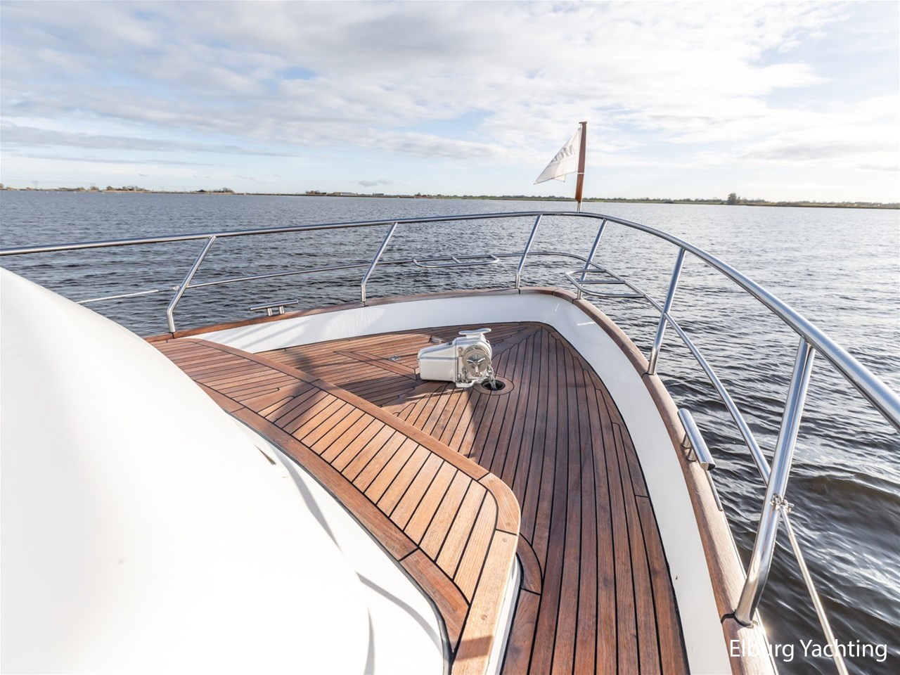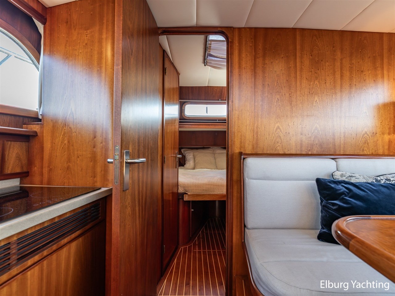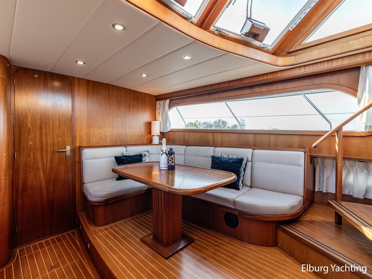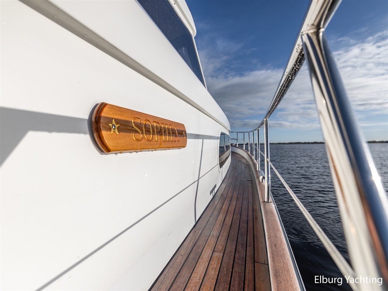 De Mulder Favorite 46 is een elegant en degelijk motorjacht, ontworpen door Guido de Groot en gebouwd door de gerenommeerde werf Mulder Shipyard. Dit jacht straalt tijdloze klasse uit en is ontworpen voor comfortabel en stijlvol verblijf aan boord. De ruime open kuip staat in directe verbinding met de salon en het stuurhuis, wat zorgt voor een open en lichte leefruimte. Het interieur is klassiek uitgevoerd in mahoniehout en voorzien van lichte, recent vernieuwde stoffering. Dankzij de twee hutten, elk met eigen sanitair, is het schip uitstekend geschikt voor langer verblijf aan boord. Tussen 2021 en 2025 is er breed geïnvesteerd in techniek, afwerking en uitrusting. Het teakdek is in 2023-2024 volledig vernieuwd door Jonker Jachtbouw. Het onderwaterschip is in diezelfde periode gestraald en behandeld met nieuwe antifouling. In 2023 is groot motoronderhoud uitgevoerd, inclusief de plaatsing van twee nieuwe turbo’s. In 2024 is aanvullende service aan de motoren uitgevoerd. Het jacht is voorzien van schroefassen en vierblads schroeven. De generator is in mei 2025 geserviced. De kruissnelheid bedraagt ca. 8 knopen bij 2500 rpm, met een maximale snelheid van ca. 11 knopen bij 3300 rpm. De economische vaarsnelheid ligt rond de ca. 7 knopen bij 2200 rpm. Qua uitrusting is het jacht voorzien van een uitgebreid en recent vernieuwd Raymarine-navigatiesysteem met onder andere twee Axiom 12” displays, radar, AIS, GPS, autopilot met afstandsbediening, VHF, windmeter en een camera op de radarboog. In 2023-2024 is er een nieuwe hekschroef met afstandsbediening aangebracht, naast de bestaande boegschroef. De kussens op het voordek zijn aanwezig en in 2023-2024 vernieuwd. Verder is het jacht uitgerust met RVS fenderhouders en een zoeklicht. Volledige documentatie van de werkzaamheden is op aanvraag beschikbaar. Voor vragen en/of het maken van een afspraak bent u 7 dagen per week van harte welkom bij Elburg Yachting.
