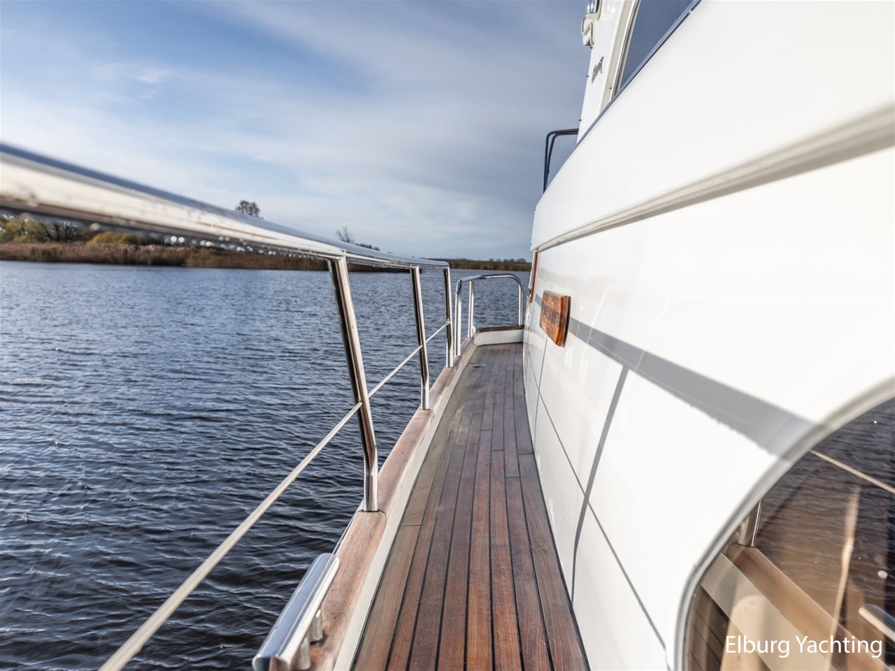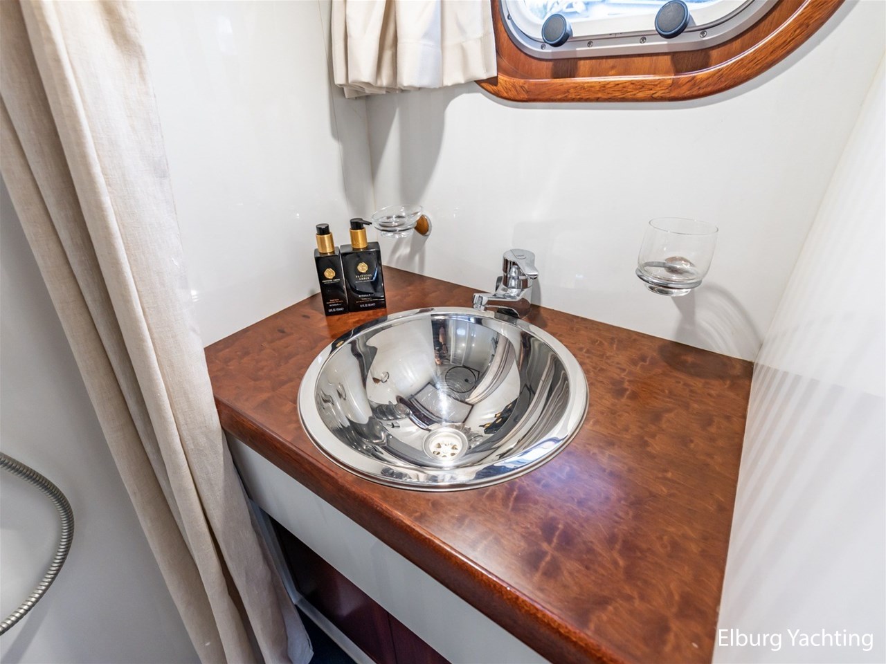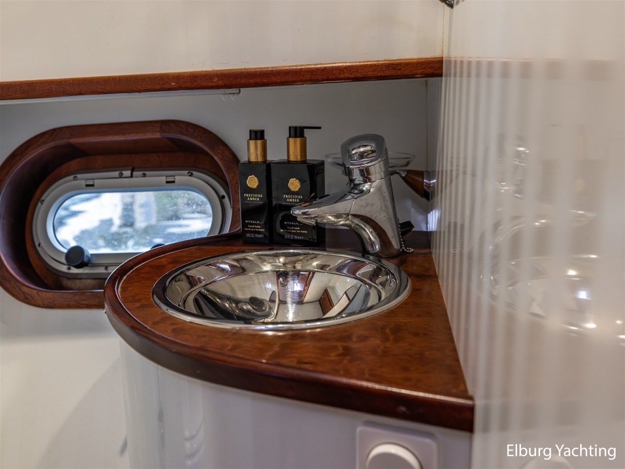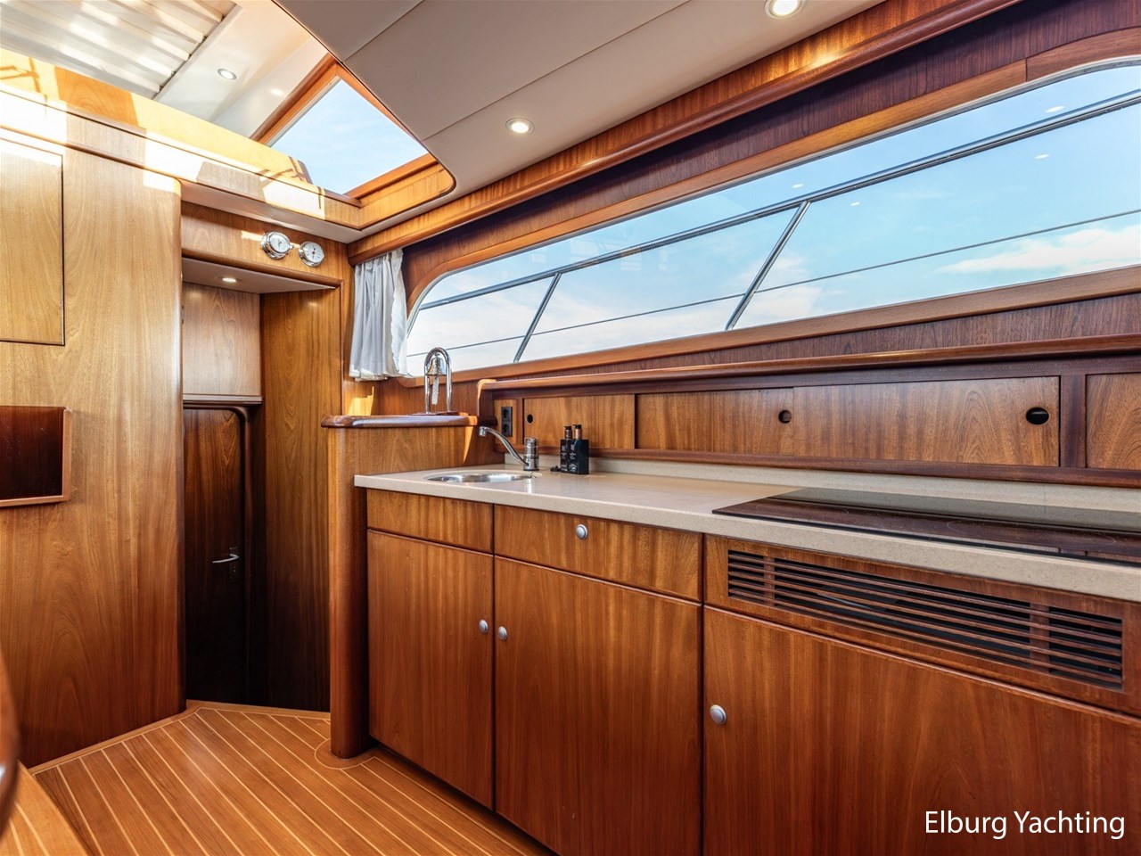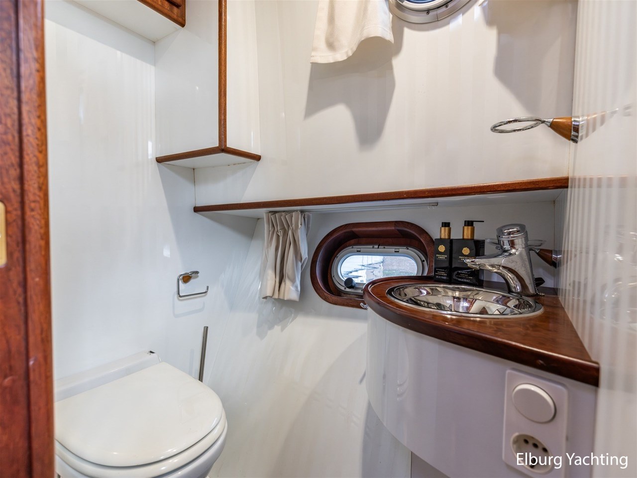 De Mulder Favorite 46 is een elegant en degelijk motorjacht, ontworpen door Guido de Groot en gebouwd door de gerenommeerde werf Mulder Shipyard. Dit jacht straalt tijdloze klasse uit en is ontworpen voor comfortabel en stijlvol verblijf aan boord. De ruime open kuip staat in directe verbinding met de salon en het stuurhuis, wat zorgt voor een open en lichte leefruimte. Het interieur is klassiek uitgevoerd in mahoniehout en voorzien van lichte, recent vernieuwde stoffering. Dankzij de twee hutten, elk met eigen sanitair, is het schip uitstekend geschikt voor langer verblijf aan boord. Tussen 2021 en 2025 is er breed geïnvesteerd in techniek, afwerking en uitrusting. Het teakdek is in 2023-2024 volledig vernieuwd door Jonker Jachtbouw. Het onderwaterschip is in diezelfde periode gestraald en behandeld met nieuwe antifouling. In 2023 is groot motoronderhoud uitgevoerd, inclusief de plaatsing van twee nieuwe turbo’s. In 2024 is aanvullende service aan de motoren uitgevoerd. Het jacht is voorzien van schroefassen en vierblads schroeven. De generator is in mei 2025 geserviced. De kruissnelheid bedraagt ca. 8 knopen bij 2500 rpm, met een maximale snelheid van ca. 11 knopen bij 3300 rpm. De economische vaarsnelheid ligt rond de ca. 7 knopen bij 2200 rpm. Qua uitrusting is het jacht voorzien van een uitgebreid en recent vernieuwd Raymarine-navigatiesysteem met onder andere twee Axiom 12” displays, radar, AIS, GPS, autopilot met afstandsbediening, VHF, windmeter en een camera op de radarboog. In 2023-2024 is er een nieuwe hekschroef met afstandsbediening aangebracht, naast de bestaande boegschroef. De kussens op het voordek zijn aanwezig en in 2023-2024 vernieuwd. Verder is het jacht uitgerust met RVS fenderhouders en een zoeklicht. Volledige documentatie van de werkzaamheden is op aanvraag beschikbaar. Voor vragen en/of het maken van een afspraak bent u 7 dagen per week van harte welkom bij Elburg Yachting.